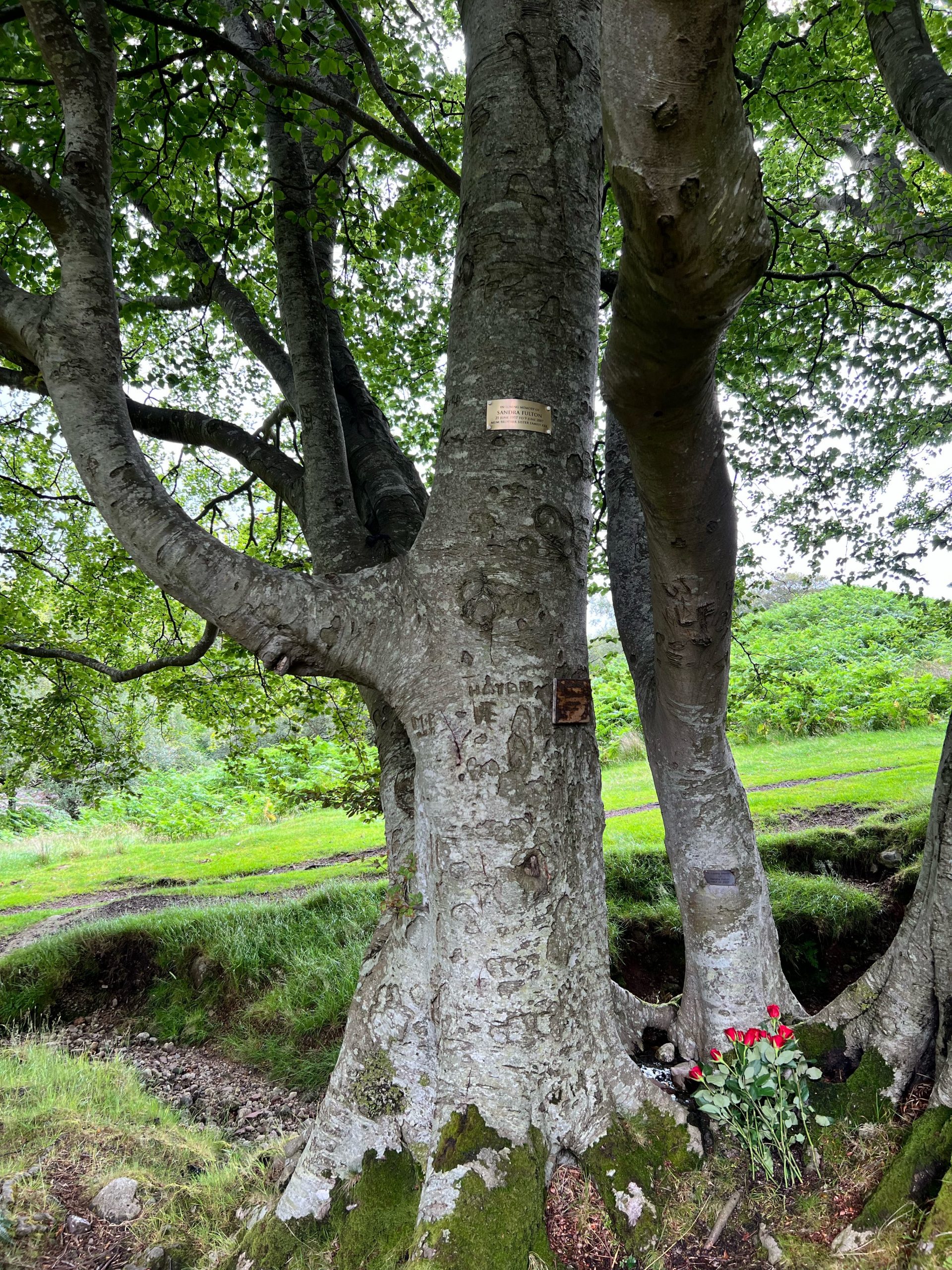 Unter ein paar knorrigen Buchen haben Wanderer gezeltet und auch hier erinnert ein Schild mit einem Strauß roter Rosen an ein viel zu früh Verstorbene.