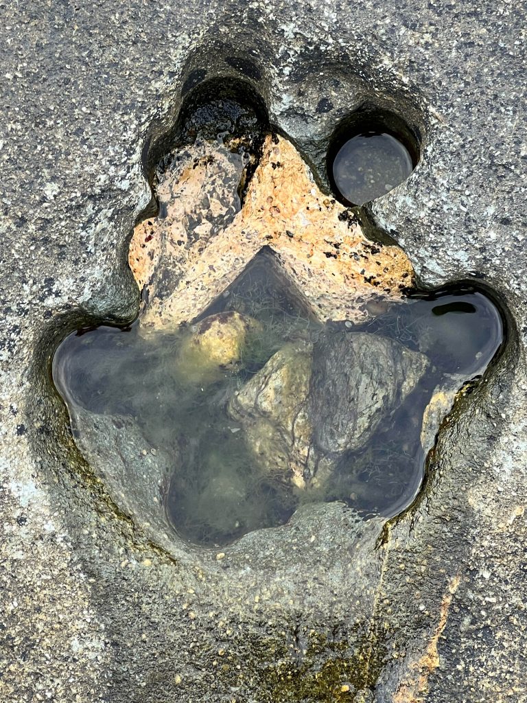 Die Abendrunde geht zu den „Fallen Stones“, ein paar Steinen die sich in der letzten Eiszeit in Richtung Strand haben fallen lassen und ca. 2 Meilen vom Stellplatz entfernt sind. Und ich “fress nen Burger”, wenn das keine Bärentatze ist. Versteinerte Reptilienspuren hatten wir ja schon.
