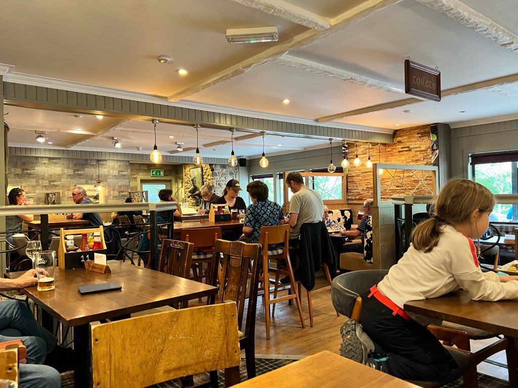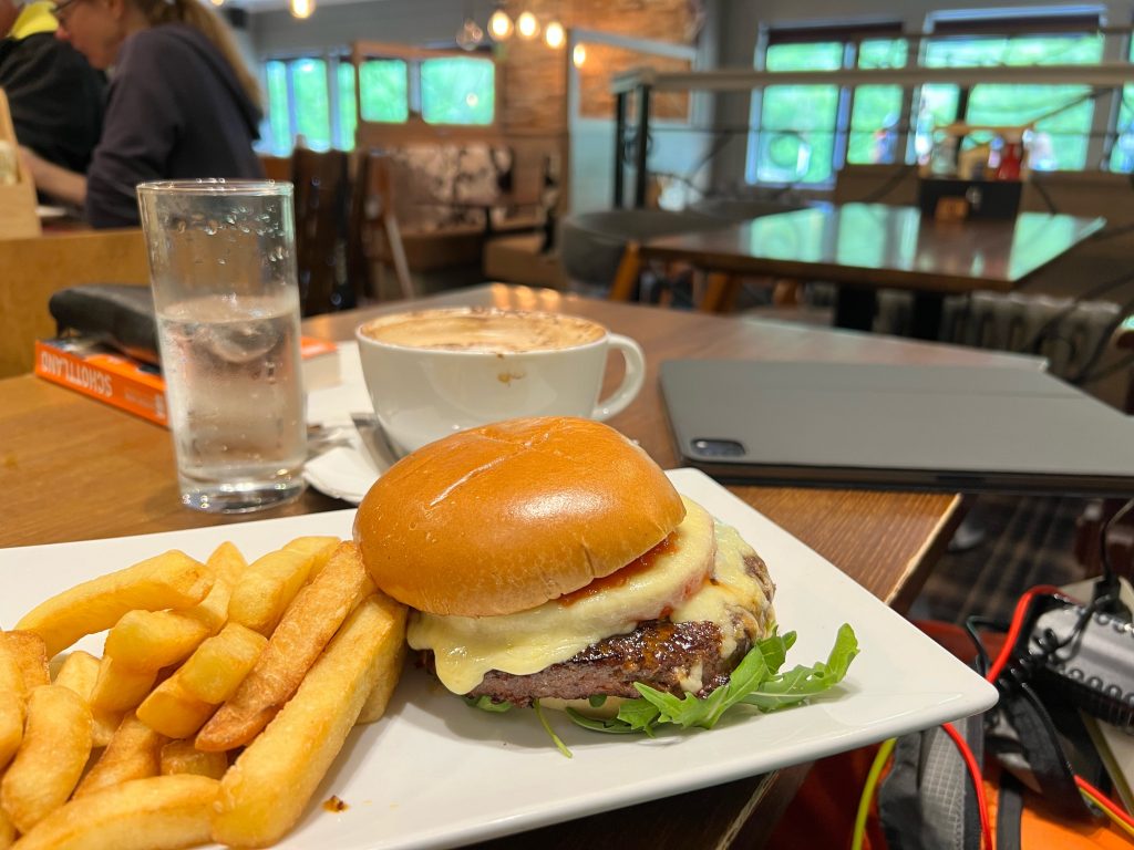 Aber da Ver- vor Entsorgung kommt, halte ich vorher am „Clachaig Inn“, das am Weg liegt. „Ich brauche zwei Dinge: Essen und Elektrizität.“, sage ich zur freundlichen Bedienung an der Bar, hinter der sich die im Reiseführer beschriebenen 160 Whiskysorten auftürmen. Sie lacht und zeigt mir die Steckdosen. So laden hier so langsam meine Geräte und ich sorge mich zum ersten Mal in einer schottischen Kneipe um mein leibliches Wohl. Da bleibt der Womoherd heute wohl kalt: Angus-Beef-Burger mit Pommes. Lecker! Zwischen mit Kuhfell bezogenen Sitzen lasse ich es mir schmecken.