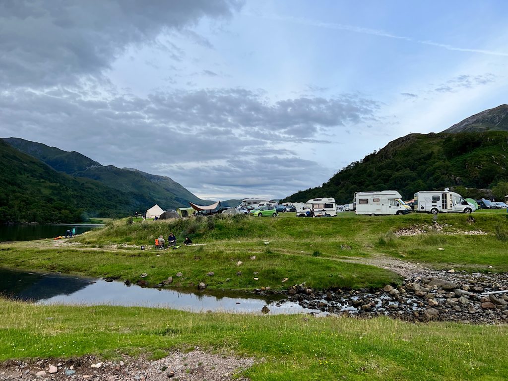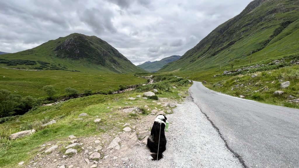 Der Rest des Wegs ist laufen – Landschaft genießen – am Wasserfall pausieren und regelmäßig den Glen-Etive-Begeisterten und ihren Fahrzeugen ausweichen. Vorschlag ans Tourismus-Management: Wanderweg wäre hier echt spitze. Meinetwegen gleich neben der Straße, aber so ist es doch etwas mühsam. Ein Womo hält noch an. Darin zwei lächelnde Frauen, die sich über Luna freuen und auf den 15 Jahre alten Border Collie zeigen, der neben ihnen im Gang friedlich schläft. das wird Luna nachher sicher auch mit Freuden tun.