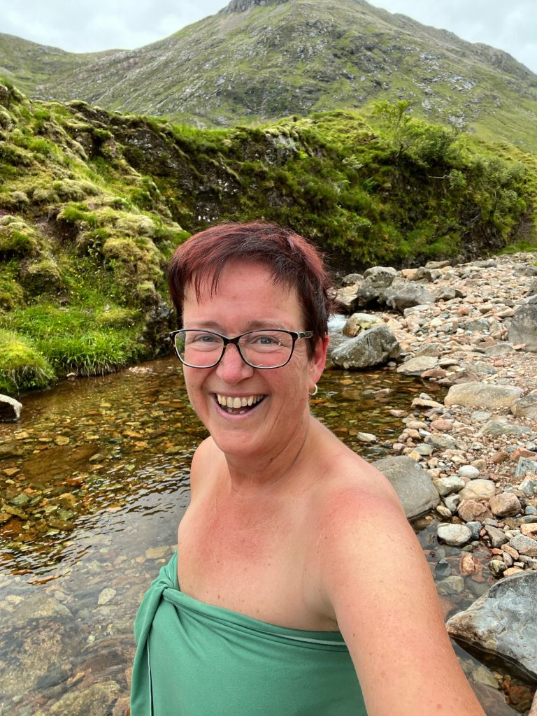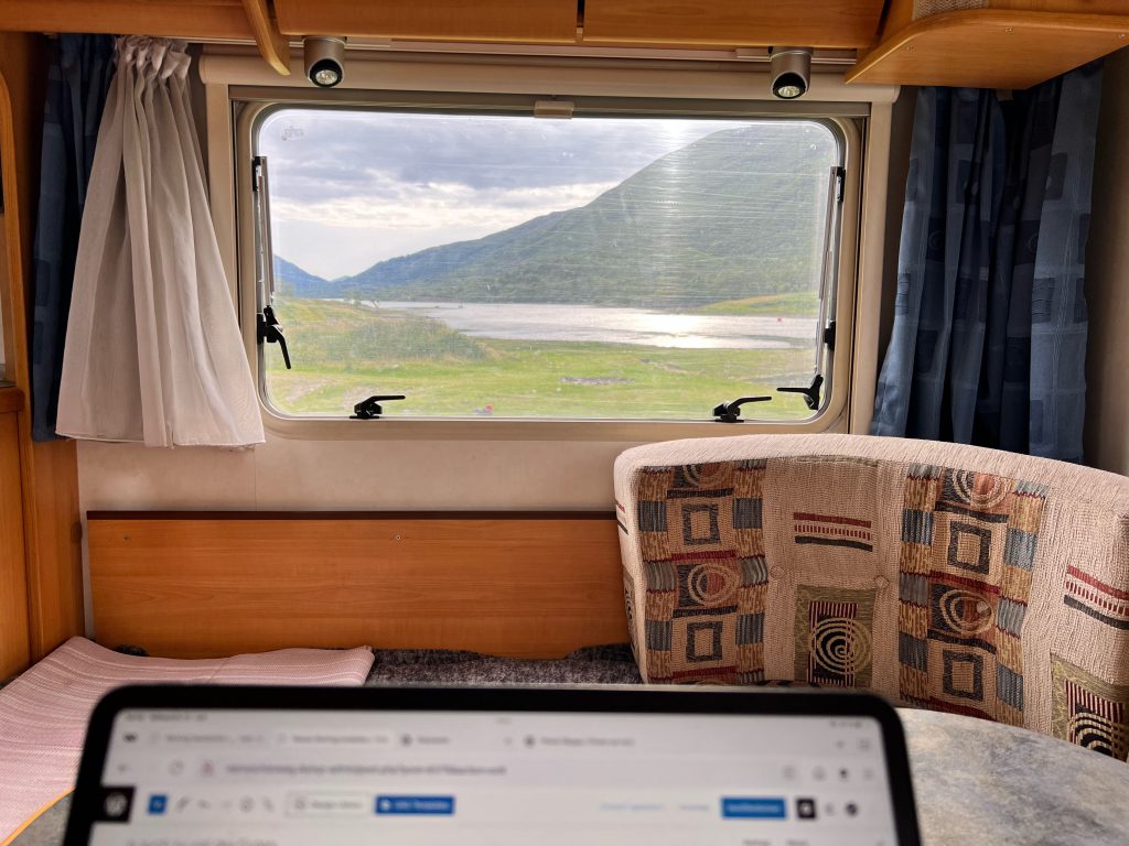 Und noch mühsamer wird’s vorn an der Hauptstraße, denn da braust der Verkehr und es gibt auf meinem Stück bis zum Parkplatz keinen Weg für Fußgänger. Doch halt, da vor in der Parkbucht steigt gerade ein junger Mann in seinen alten Van ein. Da frag ich doch mal nach, ob er uns mitnimmt. Ich klopfe ans Beifahrerfenster und ein freundliches Gesicht lächelt mich an. Auf dem Beifahrersitz, angeschnallt, ein seltsames Gefäß mit Schlauch. Ist das ein Beatmungsgerät. Oh, hoffentlich mache ich dem jetzt keine Umstände… So krank sieht der aber garnicht aus. Hübscher junger Mann, fröhliches Gesicht und ziemlich unaufgeräumter Van. Sieht nach Traveller aus. Und tatsächlich räumt er in Windeseile den Sitz frei und freut sich über Luna. Die 5 Minuten bis zum Parkplatz hat David, so heißt der junge Mann, soviel fröhliche Energie versprüht, dass ich meine schmerzenden Füße fast vergesse. Er ist Schotte, hat nur eine Woche Urlaub und möchte bis zum nördlichsten Zipfel Schottlands und dann wieder zurück. Ich wundere mich über sein sehr gut zu verstehendes Englisch und er erzählt, dass er in London geboren ist. Jetzt lebt er hier und liebt dieses Land. Hier, im Glencoe, ist es ihm auch zu „busy“, doch er bestätigt meinen Eindruck: „Wenn du eine halbe Stunde ins Land hinein läufst, dann bist du allein.“