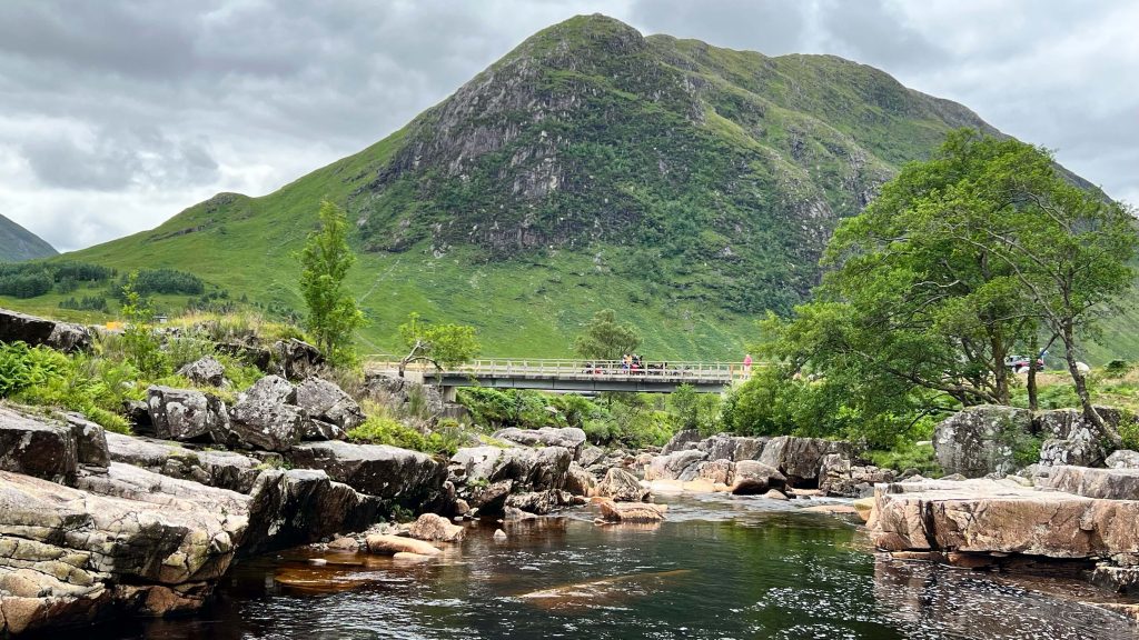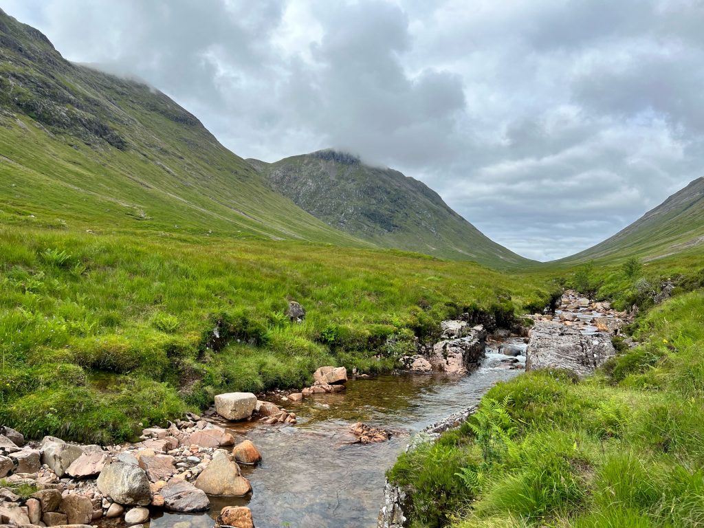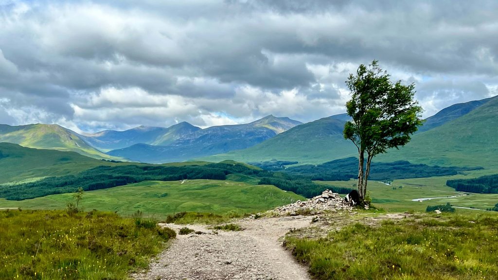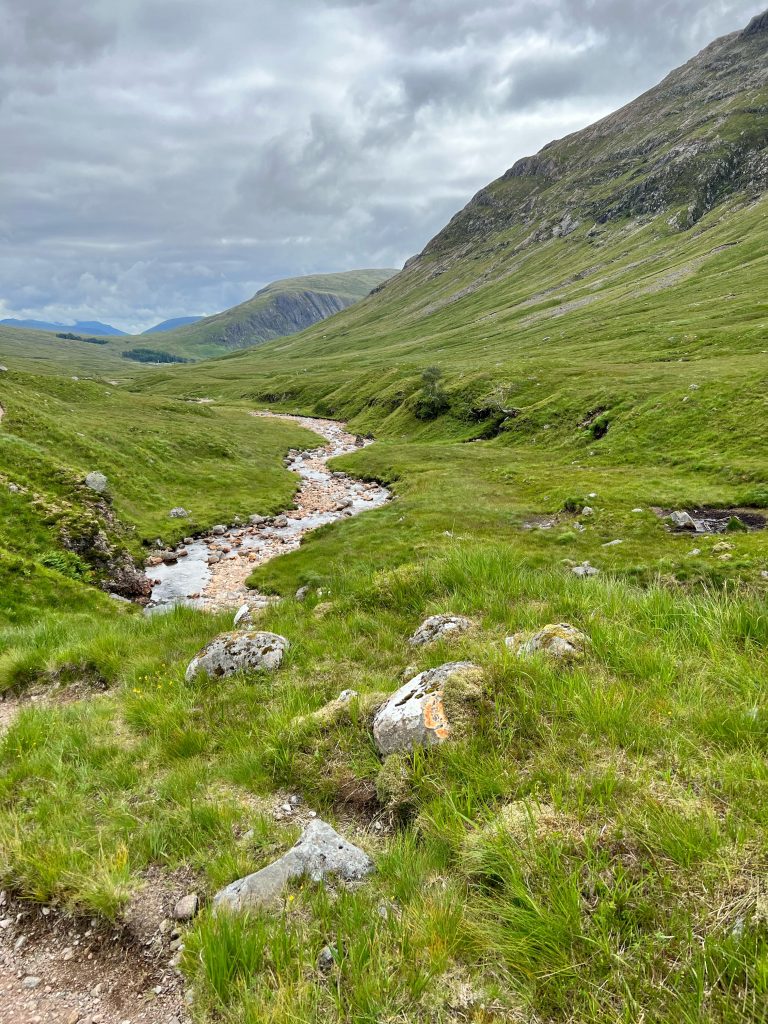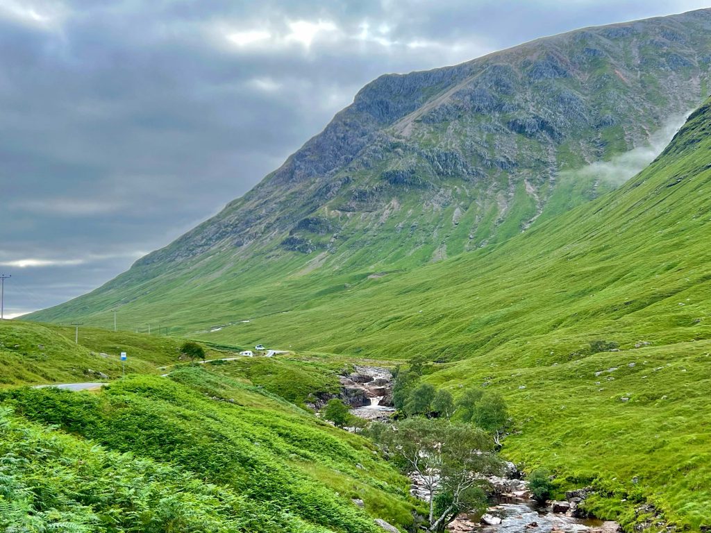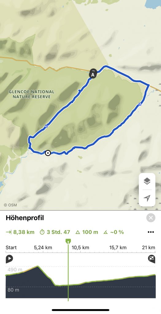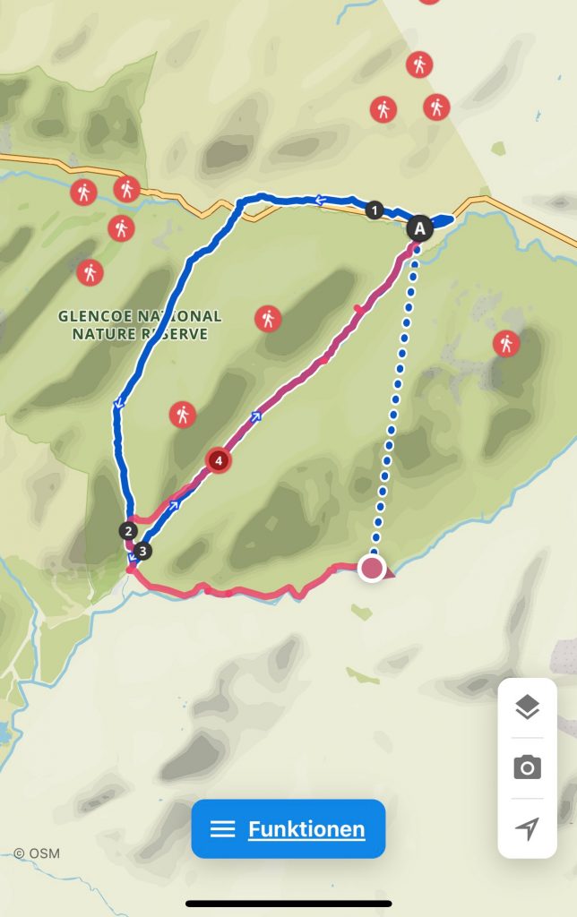 Der Boden wird rutschiger, die bauchhohen Farne wachsen über den Weg und die Füße merken erst wohin sie treten, wenn sie festen Boden, Matsch oder Geröll berühren. Das finden meine Knie nicht so gut und rufen deutlich vernehmbar „Stopp!“ Der geplante Weg würde jetzt rechts herum wieder in die Höhe führen, auf eben diesen holprigen Wegen. Oder ich gehe bequem nach links durchs Glen Etive zurück… Da gibt es allerdings keinen ausgewiesenen Wanderweg, nur die Single-Track- Road. Ich entschließe mich für die sichere Variante und nehme das James-Bond-Tal. Mein Komoot ist etwas irritiert…