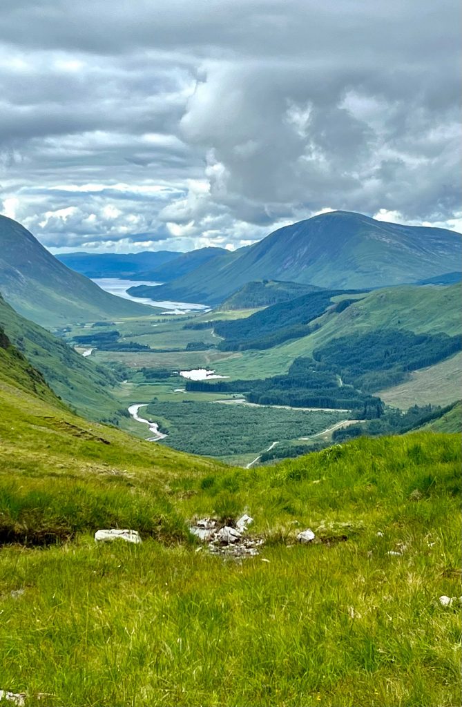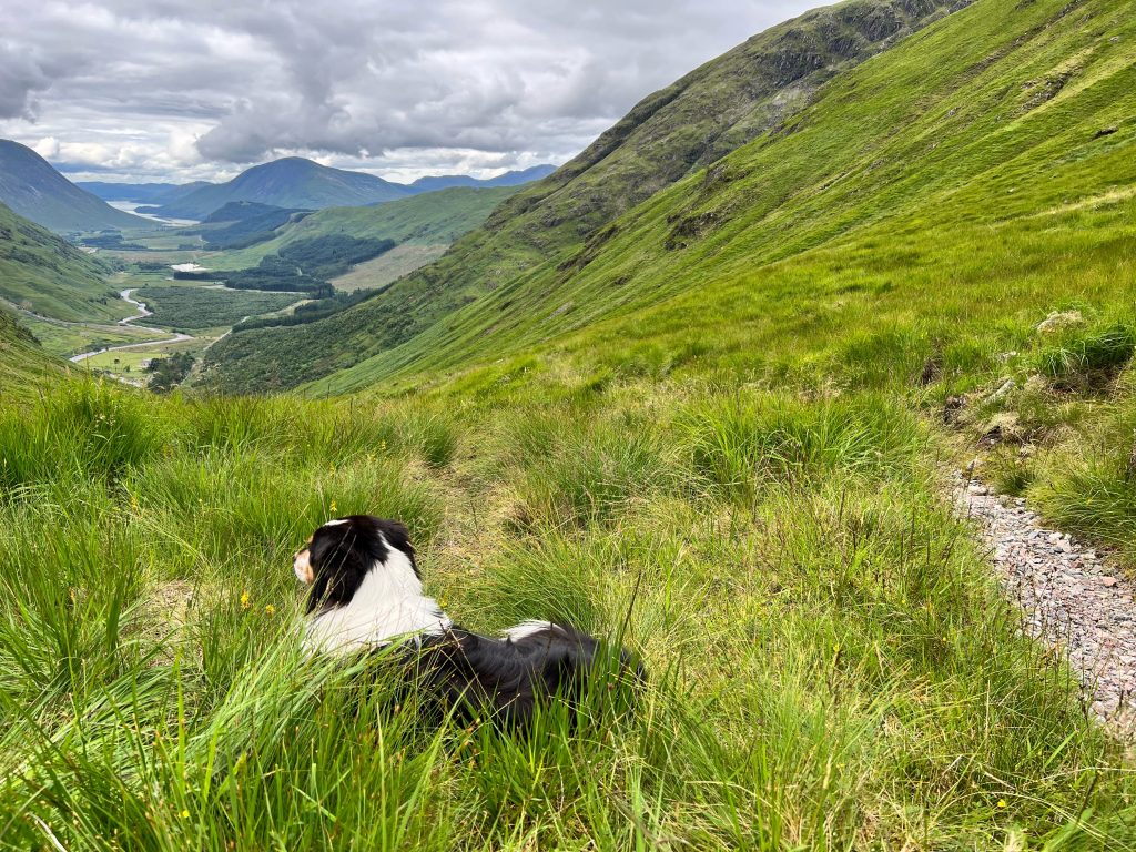 Und dann am Ende des Tales ein Ausblick: breathtaking im wahrsten Sinne. Und tatsächlich da unten haben wir übernachtet. Ich erkenne das Dalness Resort. Während ich versuche, beim Abstieg einen Fuß vor den anderen zu setzen und dabei nicht umzuknicken, auszurutschen, daneben zu treten, versuche ich immer mal wieder einen Blick in dieses tolle Tal zu erhaschen. Da hilft nur hinlegen – meint Luna.