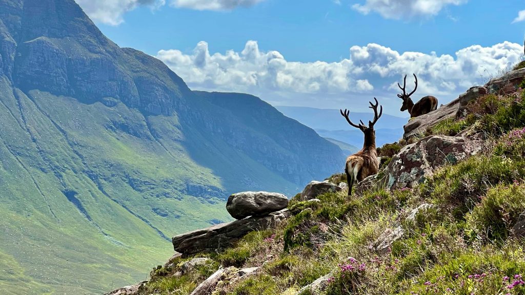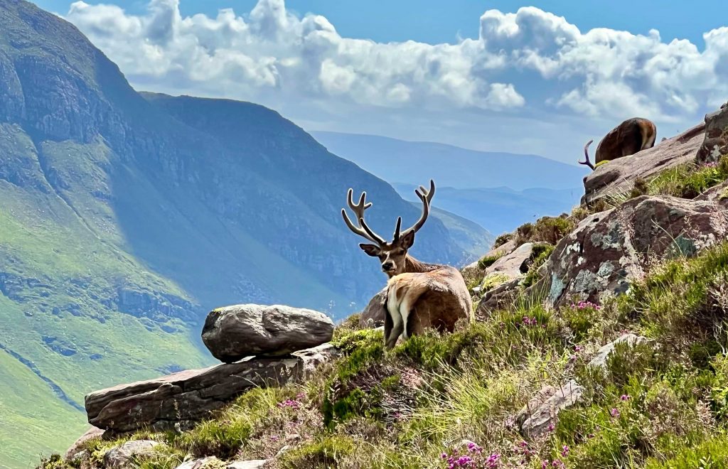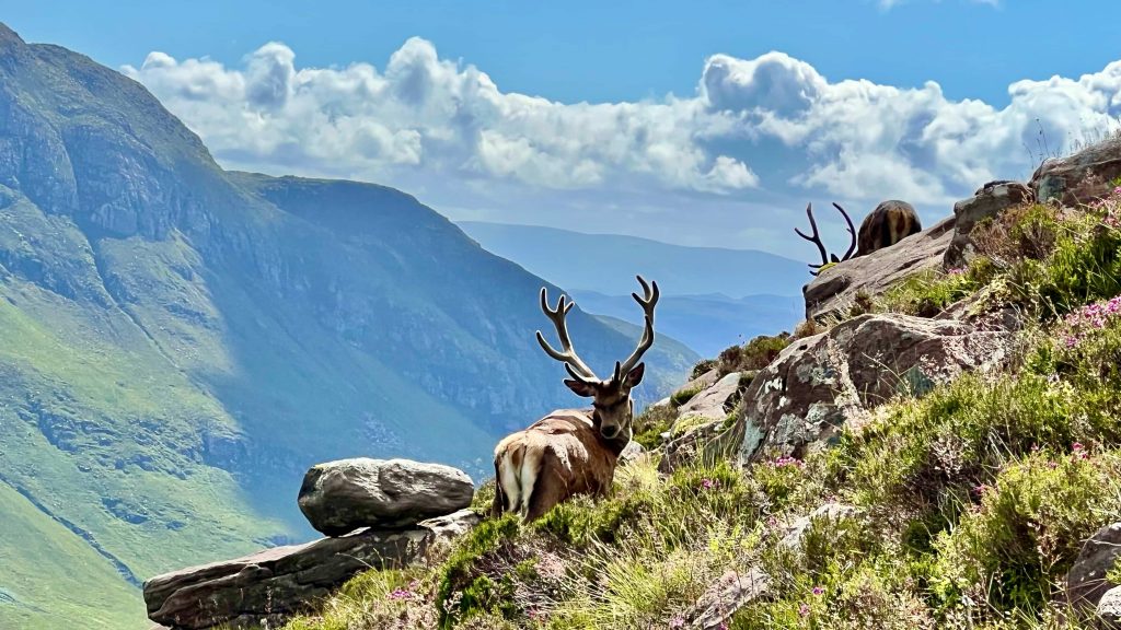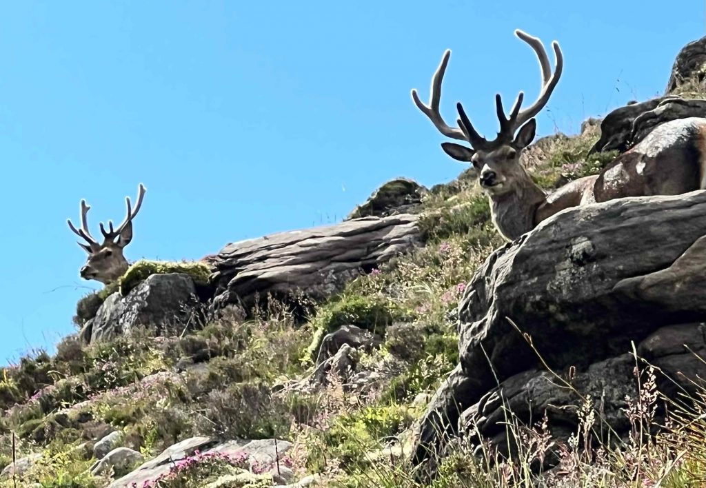 Insgesamt vier dieser imposanten Tiere grasen nicht weit vom Weg entfernt. Anscheinend sind sie menschlichen Besuch gewöhnt. Auch die völlig entgeisterte Luna ignorieren sie mit einem Gähnen. Nur ich muss mich anstrengen, denn der Gipfelanstieg ist steil. Mit einem zerrenden Hund an der Leine ist das nicht ganz so einfach. Wie gern wäre sie da jetzt hinterher und wie glücklich bin ich, dass ich sie vorher sichern konnte. Für die Hirsche, aber auch für Luna, die hier leicht hätte abstürzen können, war das defintiv die bessere Variante. Das bestätigt mir ein Frau auf dem Gipfel: It`s quite dangerous for dogs!