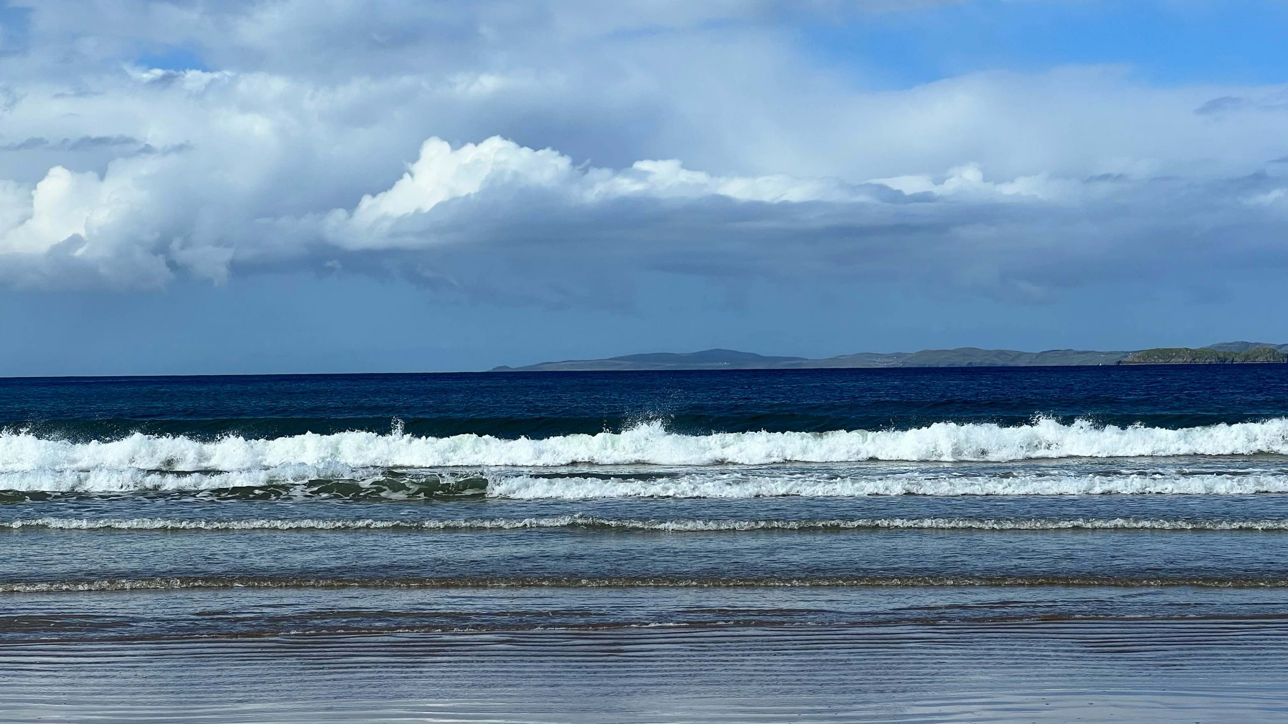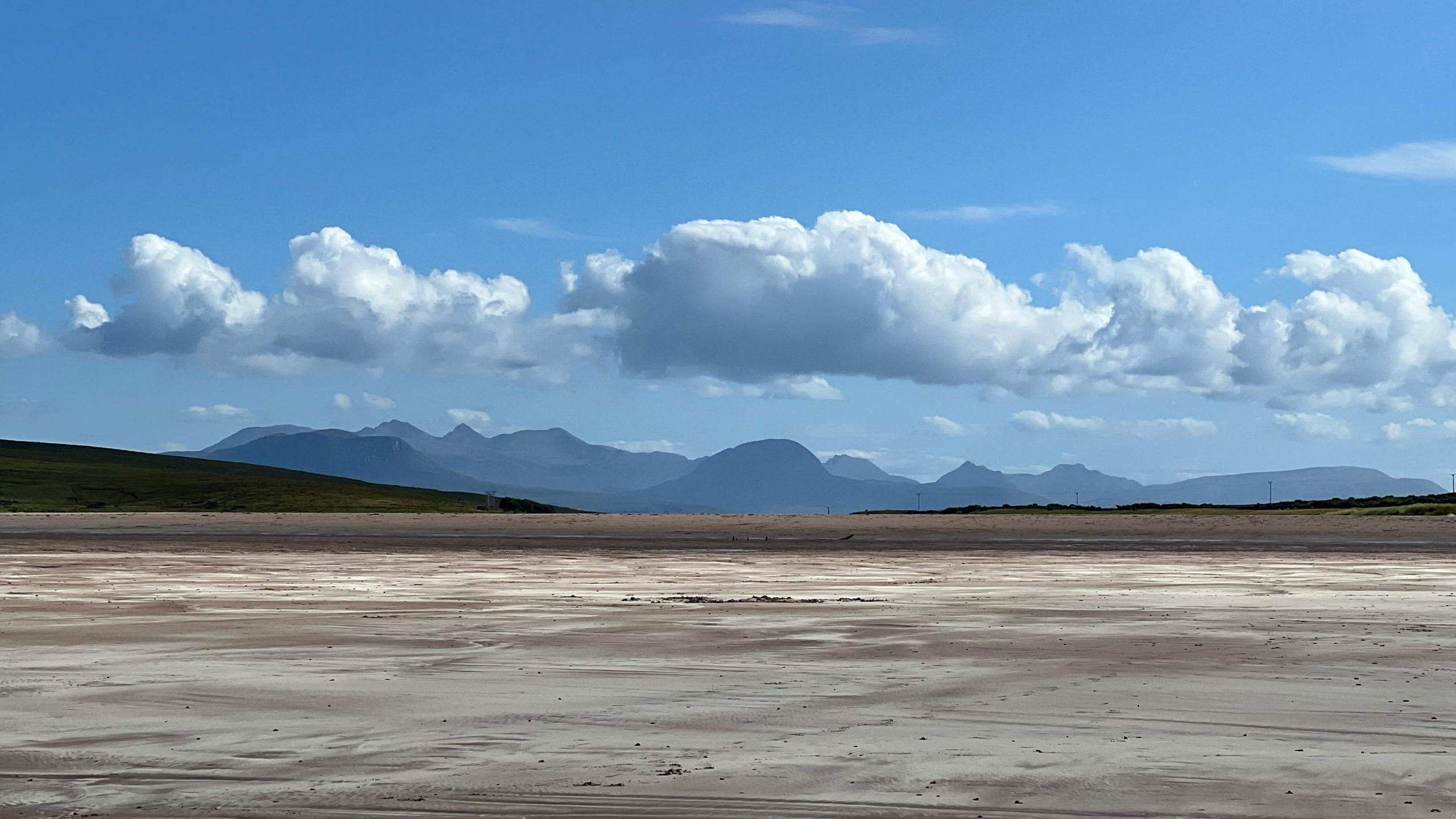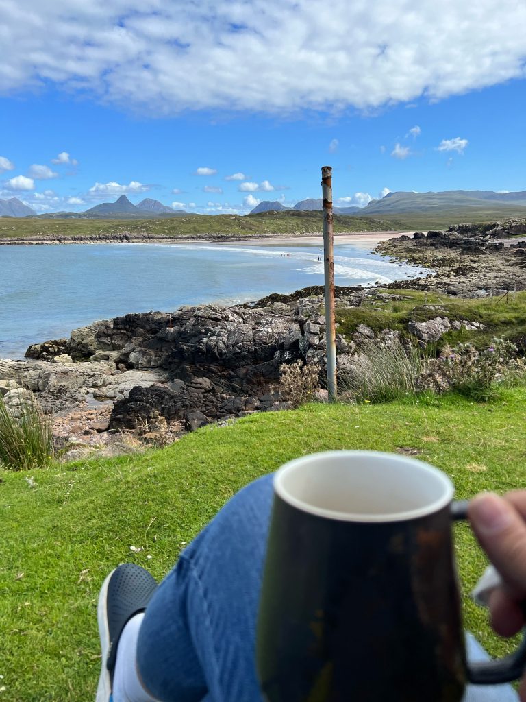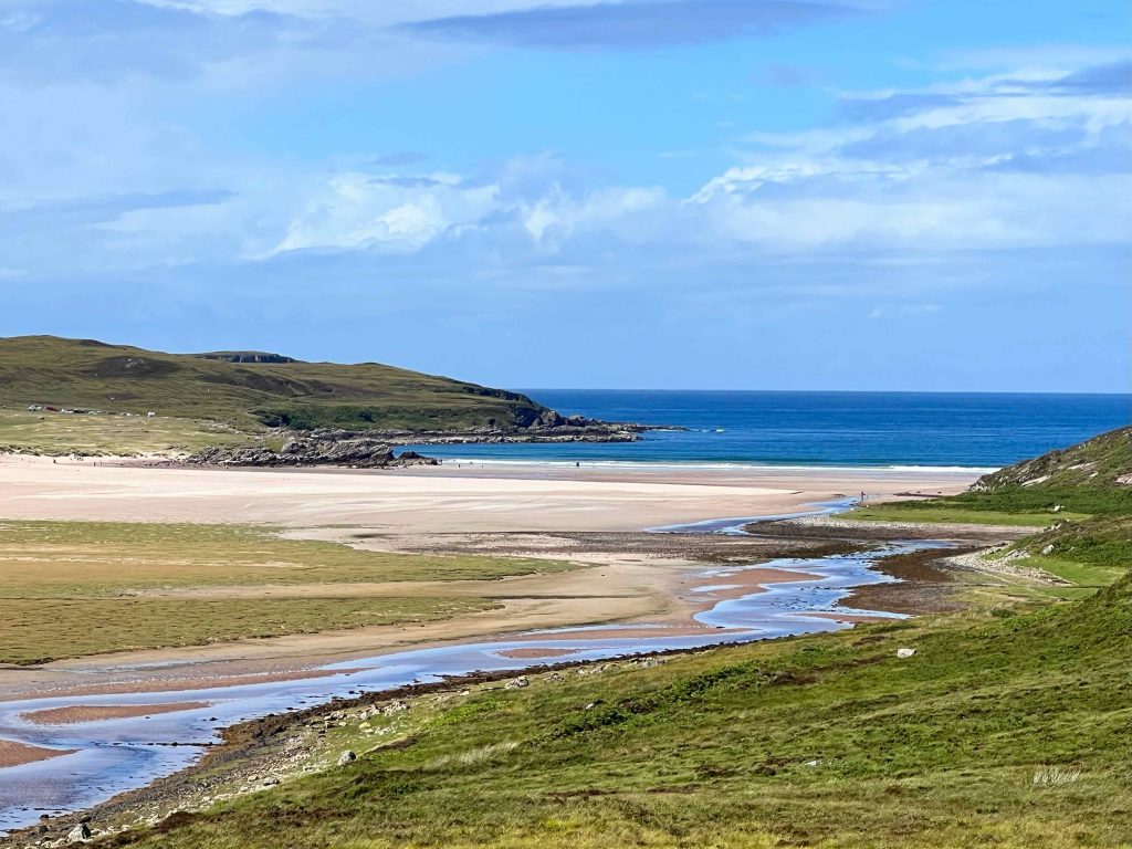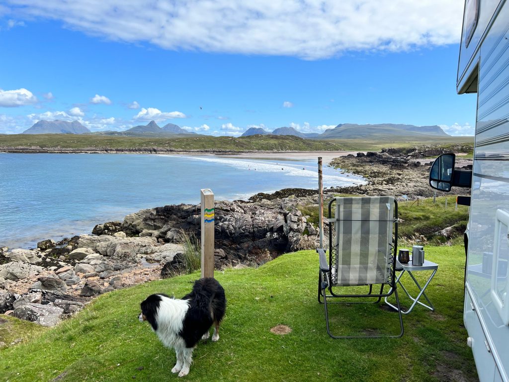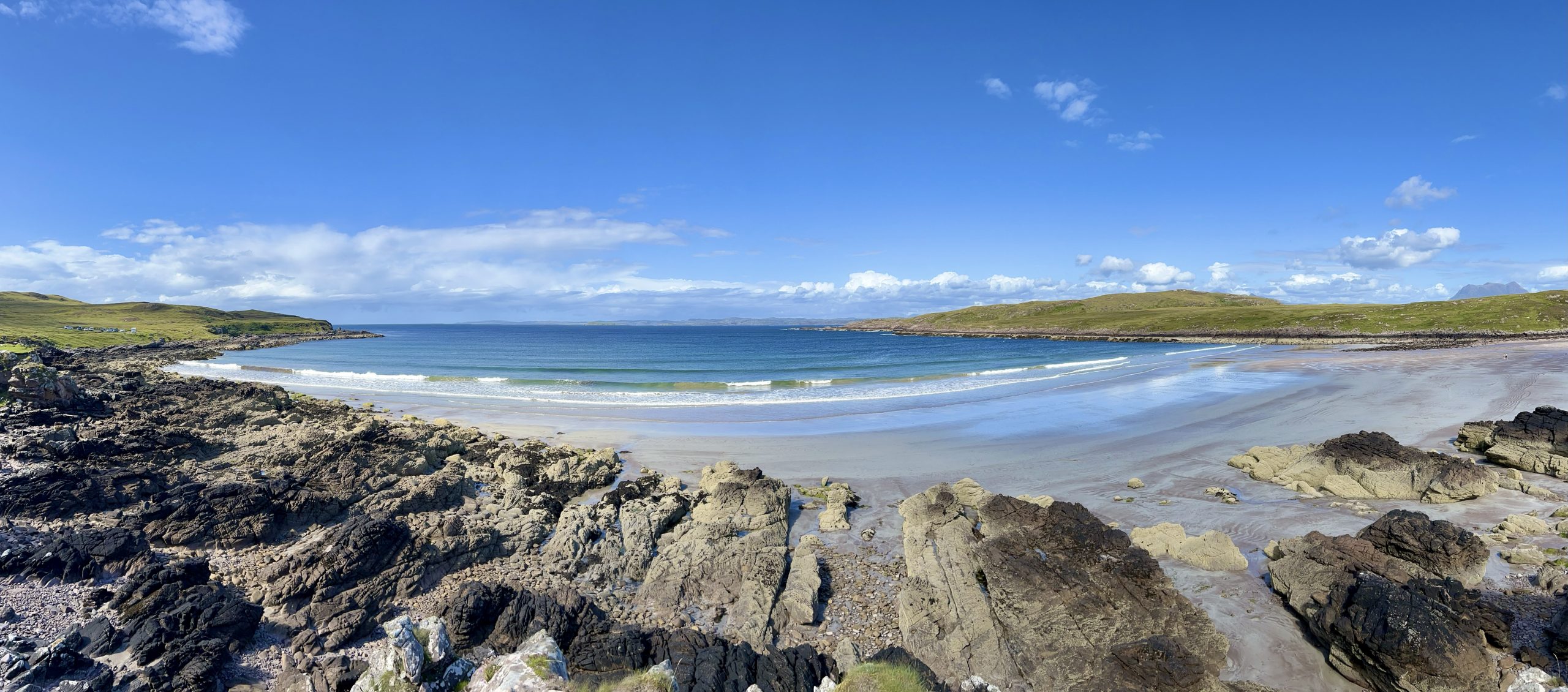 Am Nachmittag fahren wir weiter in Richtung Achiltibuie. Das werden wir aber heute nicht mehr erreichen, obwohl es nur wenige Meilen entfernt ist. Denn plötzlich tut sich rechts ein Ausblick auf… bin ich denn in der Karibik. Blaues Wasser, weiße Schaumkronen, gelber Sand. Das ist Achnahaird Bay.
