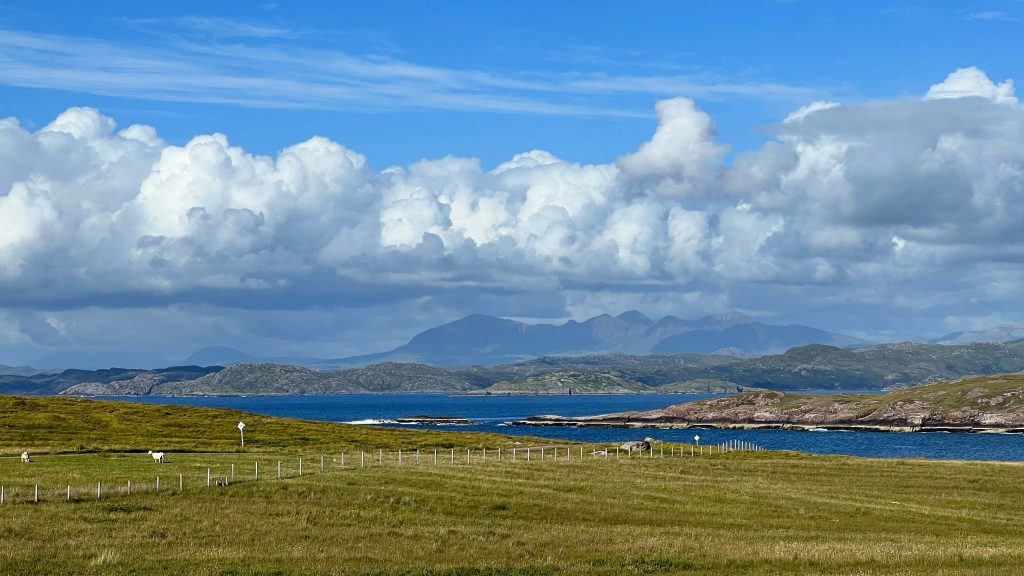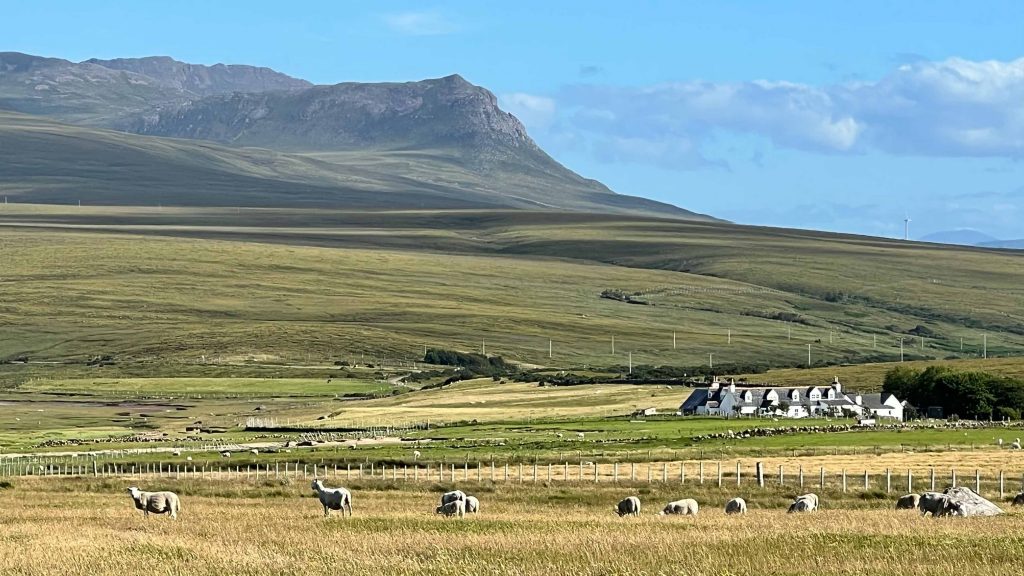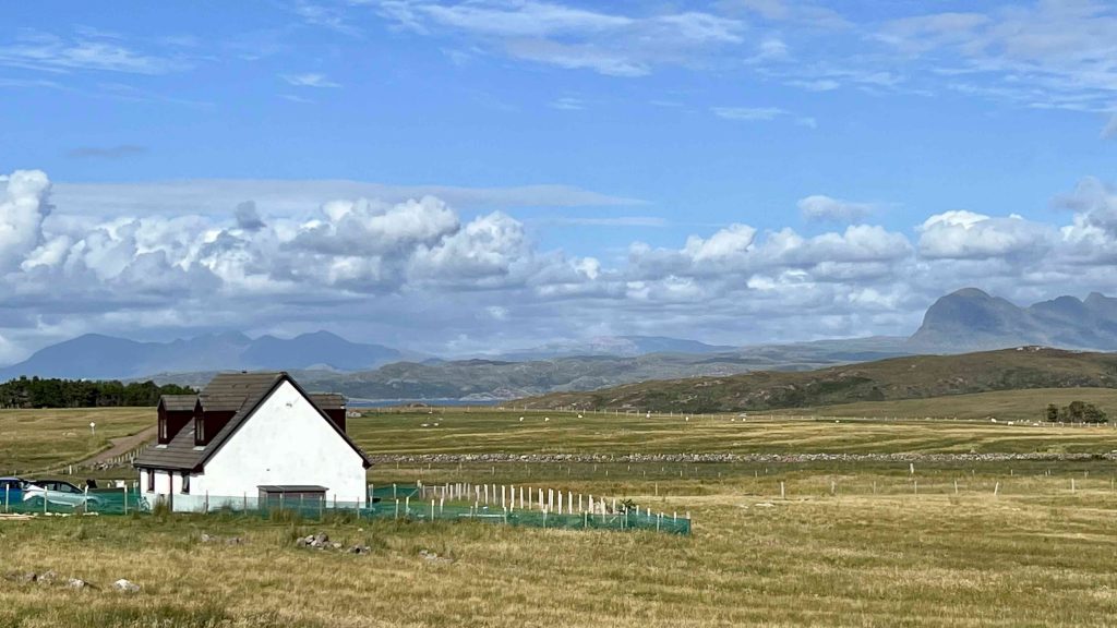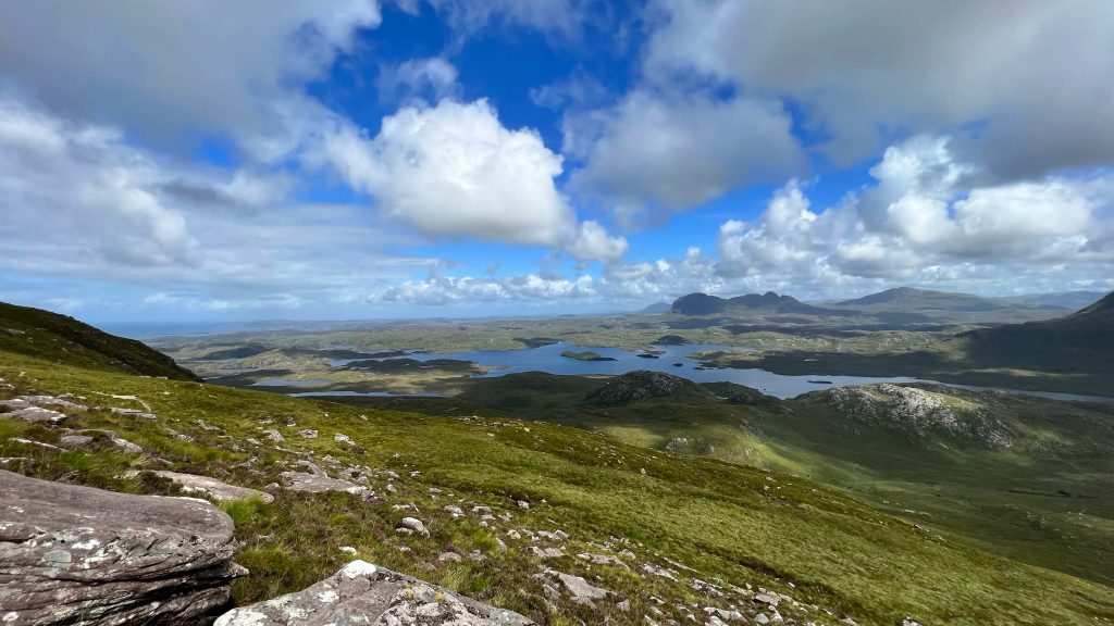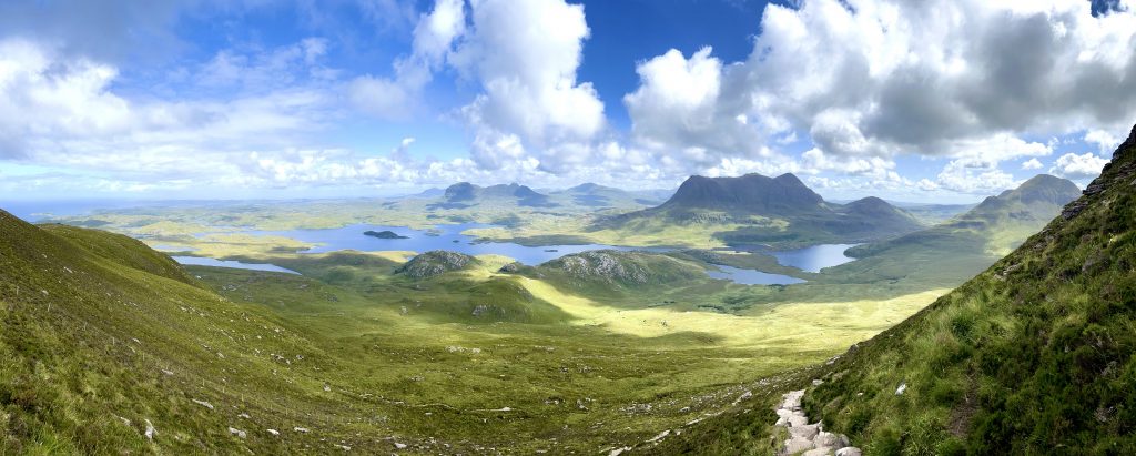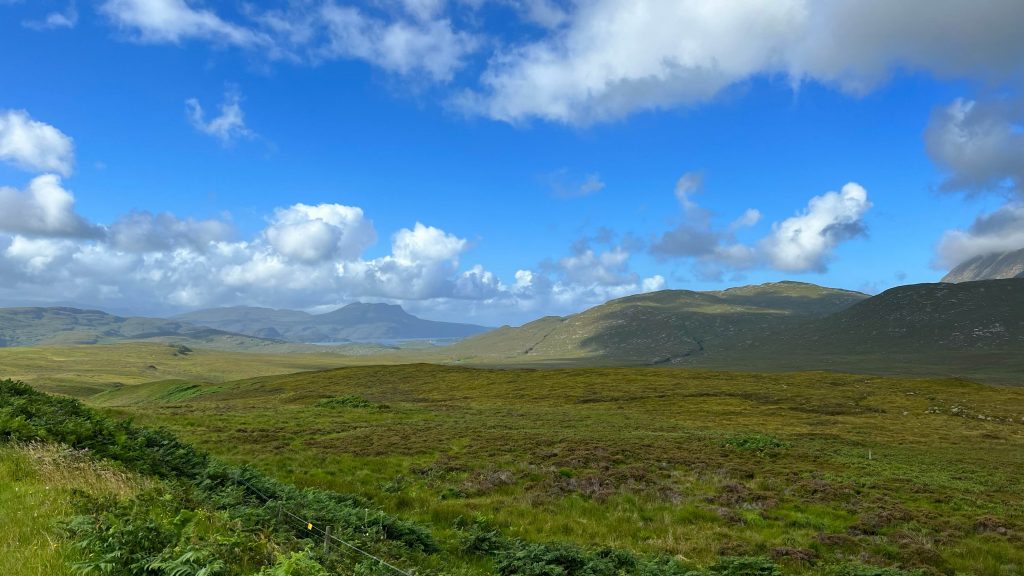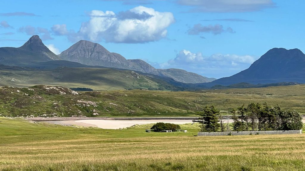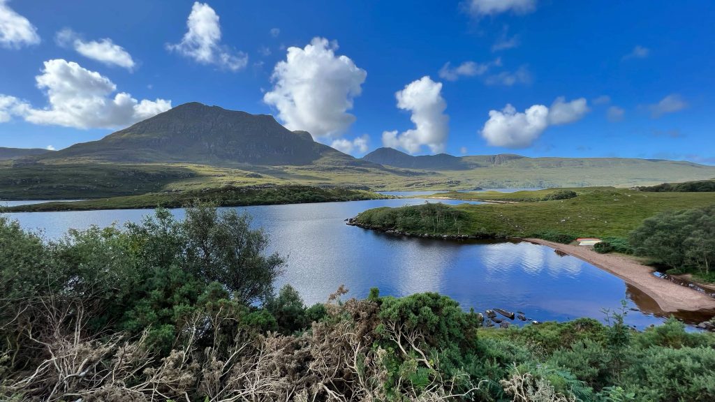 Die Straße von Ullapool nach Achiltibuie führt durch eine landschaftlich spektakuläre Region. Man fährt vorbei an dunklen Seen und Bergkegeln, die wie frei stehend aus dem Moor herausragen. Wir sind hier im North West Highlands Unesco Global Geo Park. Über Jahrmillionen, Eiszeiten, Plattentektonik, Verwerfungen und was weiß ich noch für Einflüsse hat sich diese irre Gegend gebildet, die mich gleich in ihren Bann zieht.