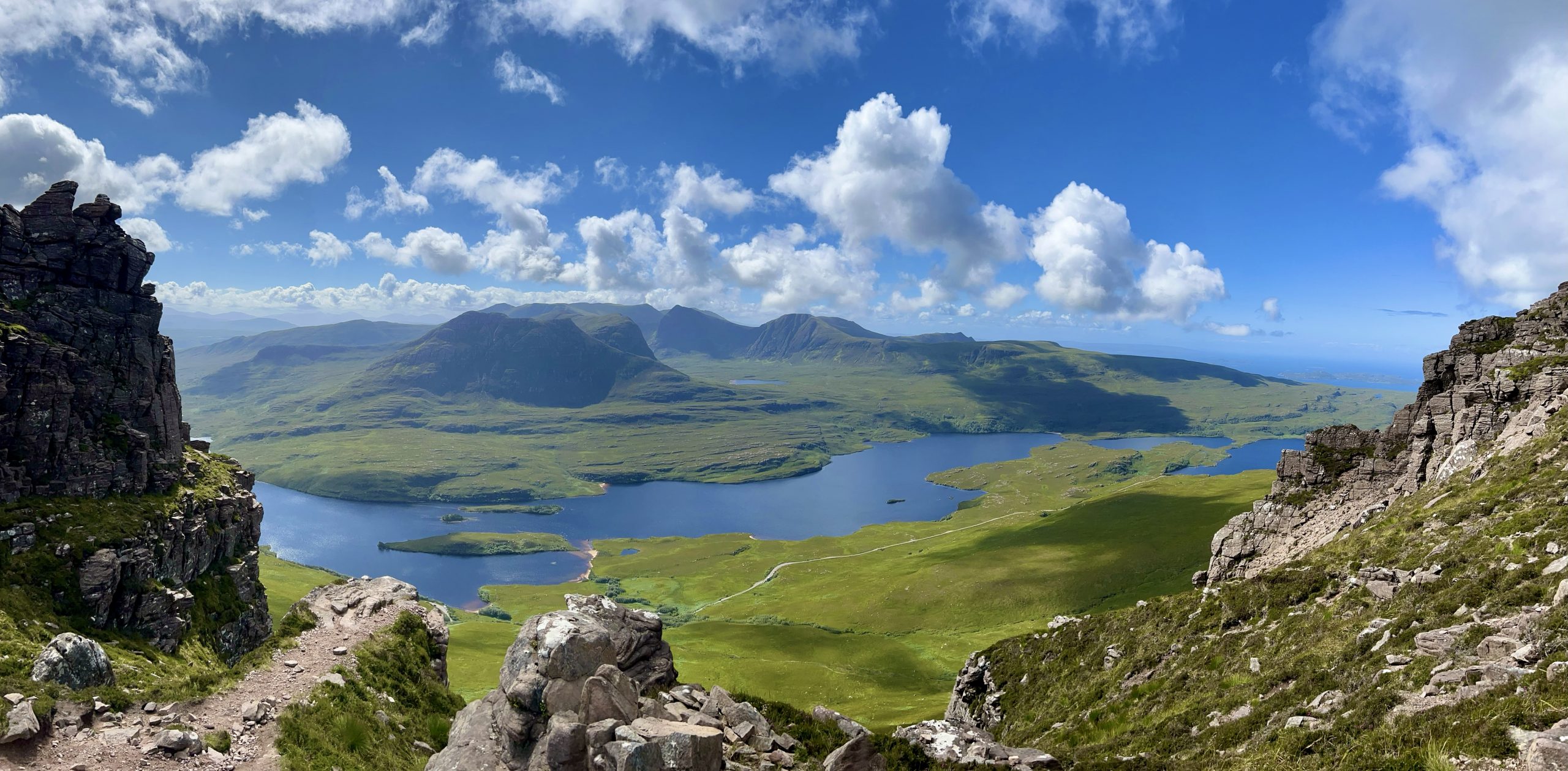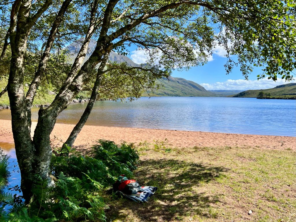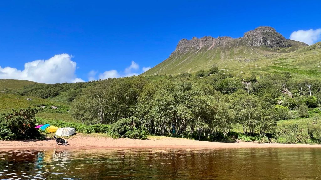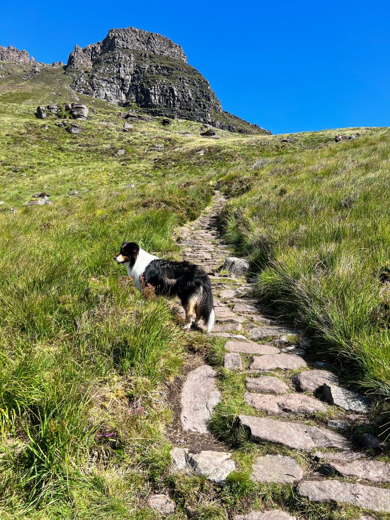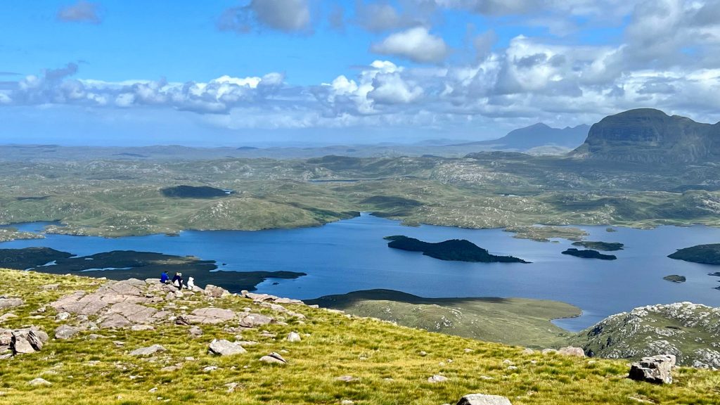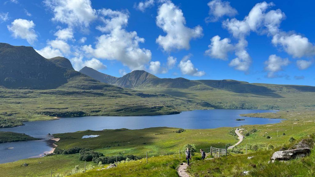 Wir kommen an diesem kleinen Strand vorbei und ich halte an, um ein Foto zu machen. Dabei bemerke ich, dass gleich nebenan der Wanderweg auf den Stac Pollaidh beginnt, der in meinem Reiseführer als “Berg zum Genießen“ beschrieben wird. Also 500 Höhenmeter zu überwinden empfinde ich jetzt nicht als unbedingten Hochgenuss, aber der Ausblick muss fantastisch sein.