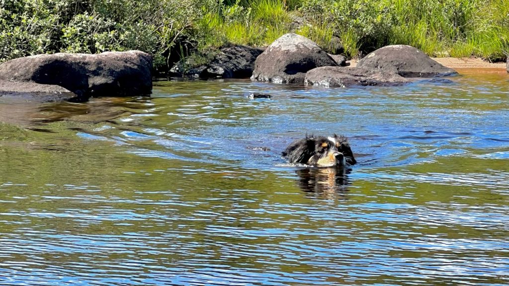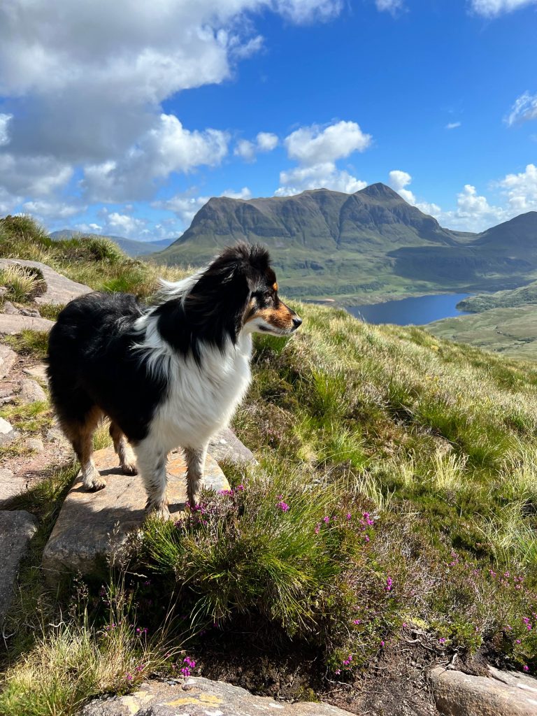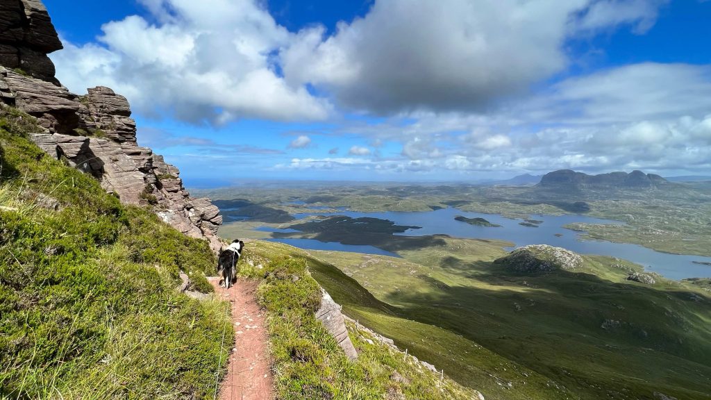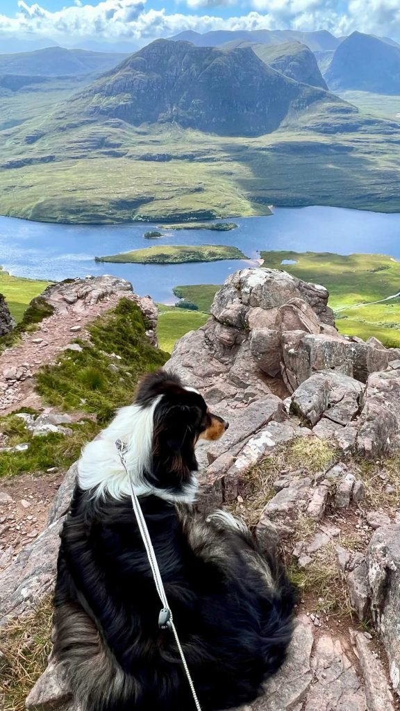 Vom Gipfel aus kann man in alle Richtungen dieser beeindruckenden Landschaft aus Wasser und Stein schauen und wir genießen es aus vollen Zügen. Auch Luna muss nach der Aufregung erst einmal verschnaufen.