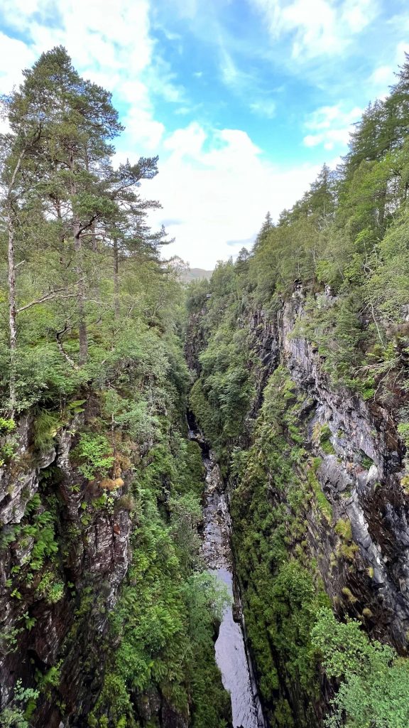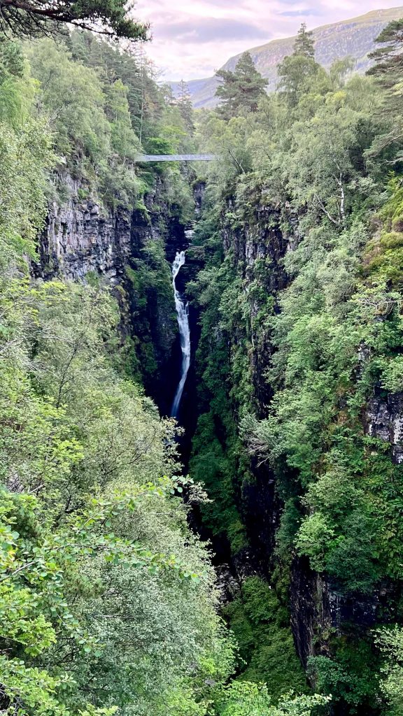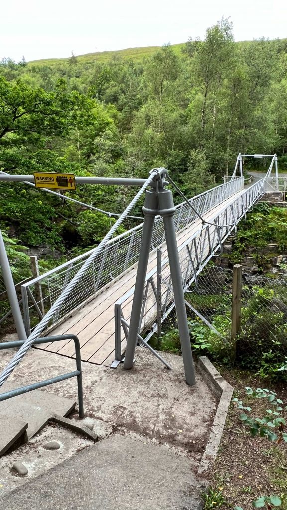Wenige Meilen weiter lohnt die Corrieshalloch Gorge einen Zwischenstopp. Über einer dramatischen 61m tiefen Schlucht schaukelt eine Hängebrücke, auf die nur 6 Leute dürfen und zwischen deren Brettern man nach unten gucken kann. Wenn ich darüber gehe, dann bewegt sie sich. Also genau mein Ding, auch Luna ist “begeistert“ und macht, dass sie auf der anderen Seite von diesem unheimlichen Ding wieder schnell runter kommt.
