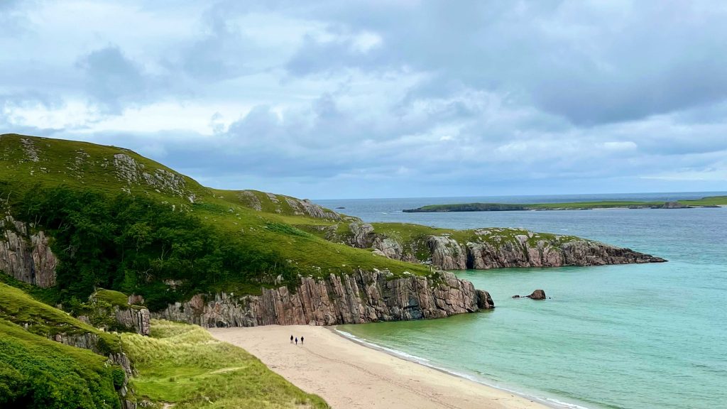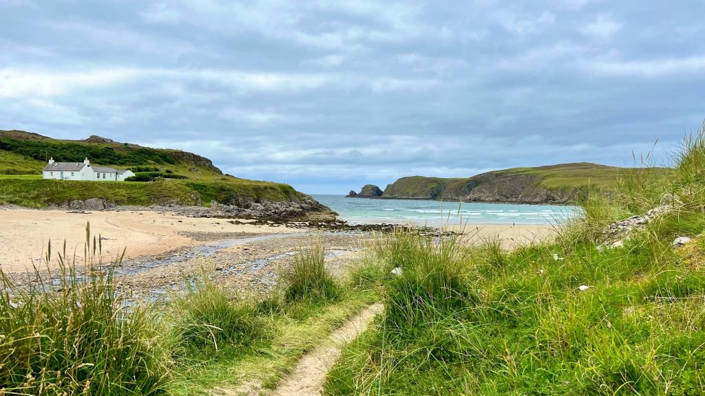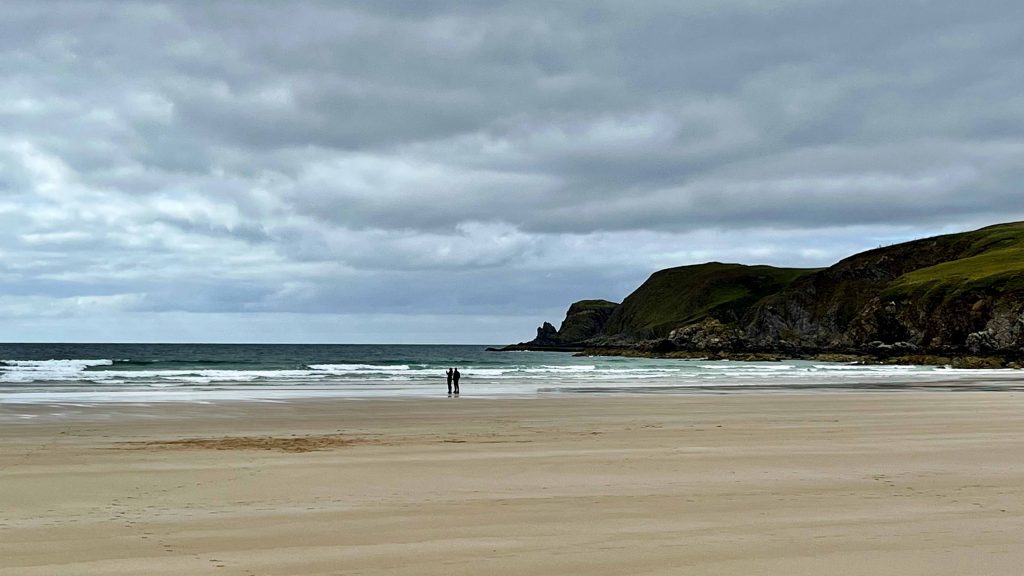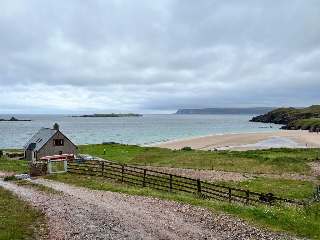 Ich fahre erst mal vorsichtig weiter, aber irgendwie ist das doof. Ich kann noch nicht mal jemanden vorbei lassen, weil die das ohne Blinker nicht verstehen und denken, ich warte auf Gegenverkehr. Wat nu? ne Strandwanderung muss her – ich brauch klaren Kopf. Der kleine Weiler Bettyhill hat einen solchen zu bieten.