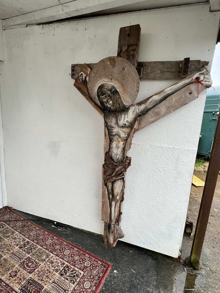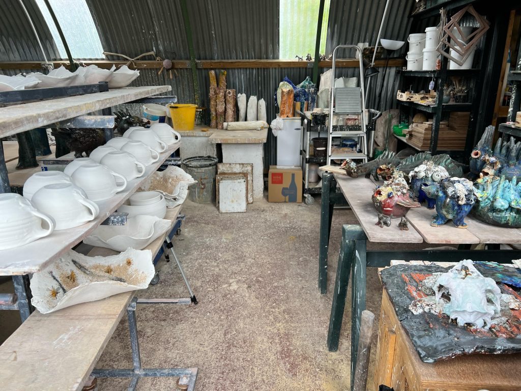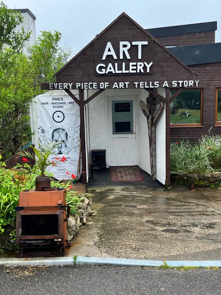 Phil hat auch ein Studio im Areal und zwei Hunde. Als ich mit Luna noch einmal übers Gelände schlendere, in der Hoffnung, doch ein paar Kunstwerke begutachten zu können, saust ein kleines kaputtes Auto an uns vorbei und parkt vor der „Art Gallery“.