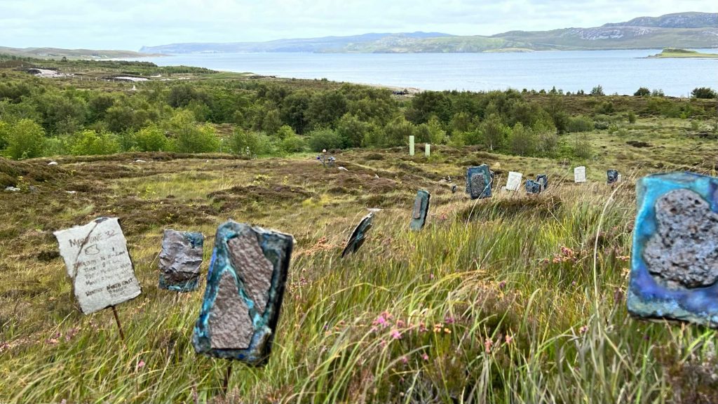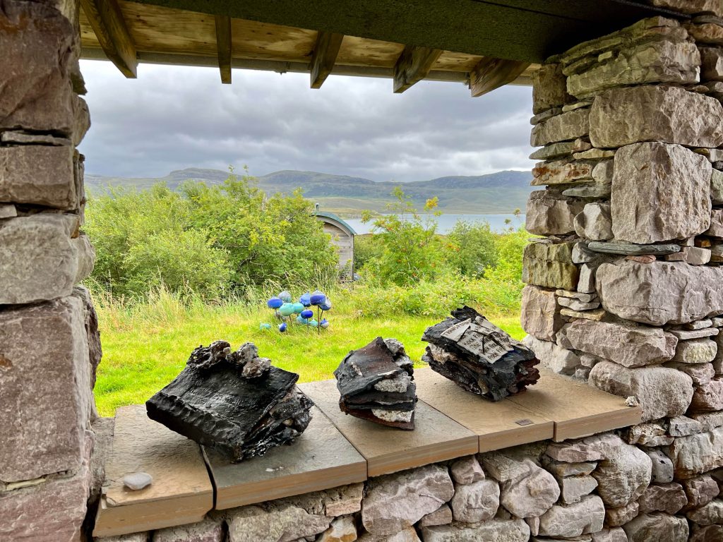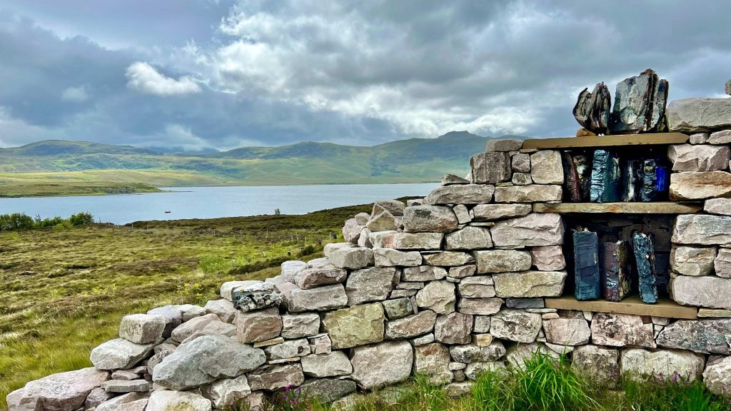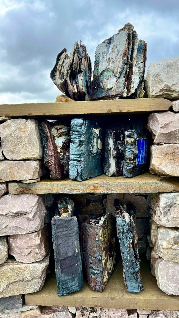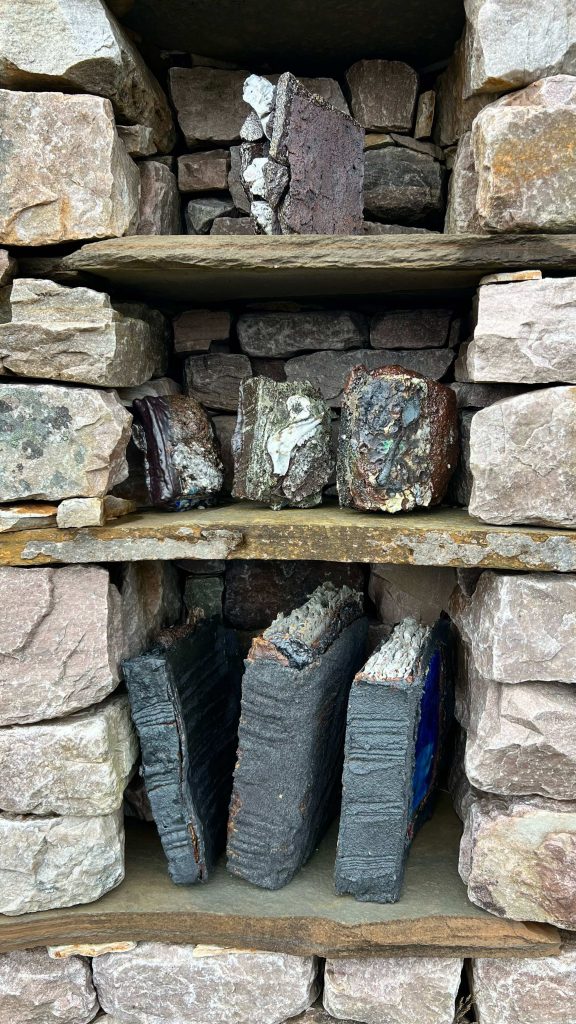 Doch am meisten faszinieren mich die steinernen Bücher. Vor allem im halbfertigen Turm, hinten im Gelände, in dem ich mich nun Schritt für Schritt willkommener fühle und immer noch allein bin. Von dieser ”Steinernen Bibliothek” hatte ich schon gelesen und dass der Turm einem piktischen ”Broch”-Rundhaus nachempfunden ist. Zwischen den tönernen ”Seiten”, die sich wellen, als hätte sie der Regeimmer wieder durchfeuchtet, sind Gesteine eingeschmolzen. Bergkristalle, Kiesel, Halbedelsteine. Die sammelt Lotte Glob auf tagelangen Wanderungen durch die schottischen Higlands… so die Autoren von ”500 Meilen Schottland”.