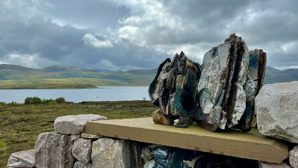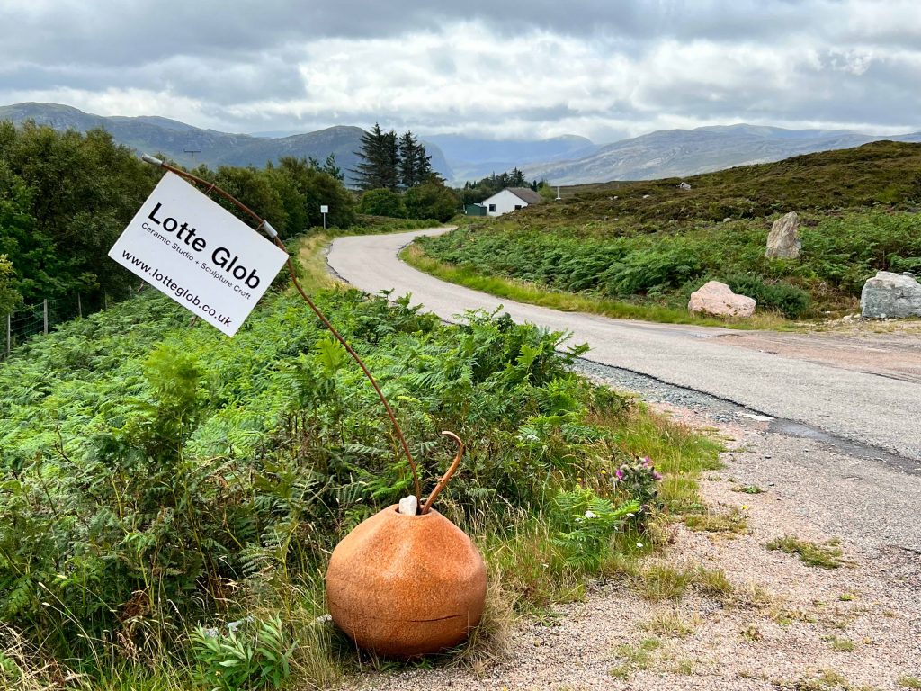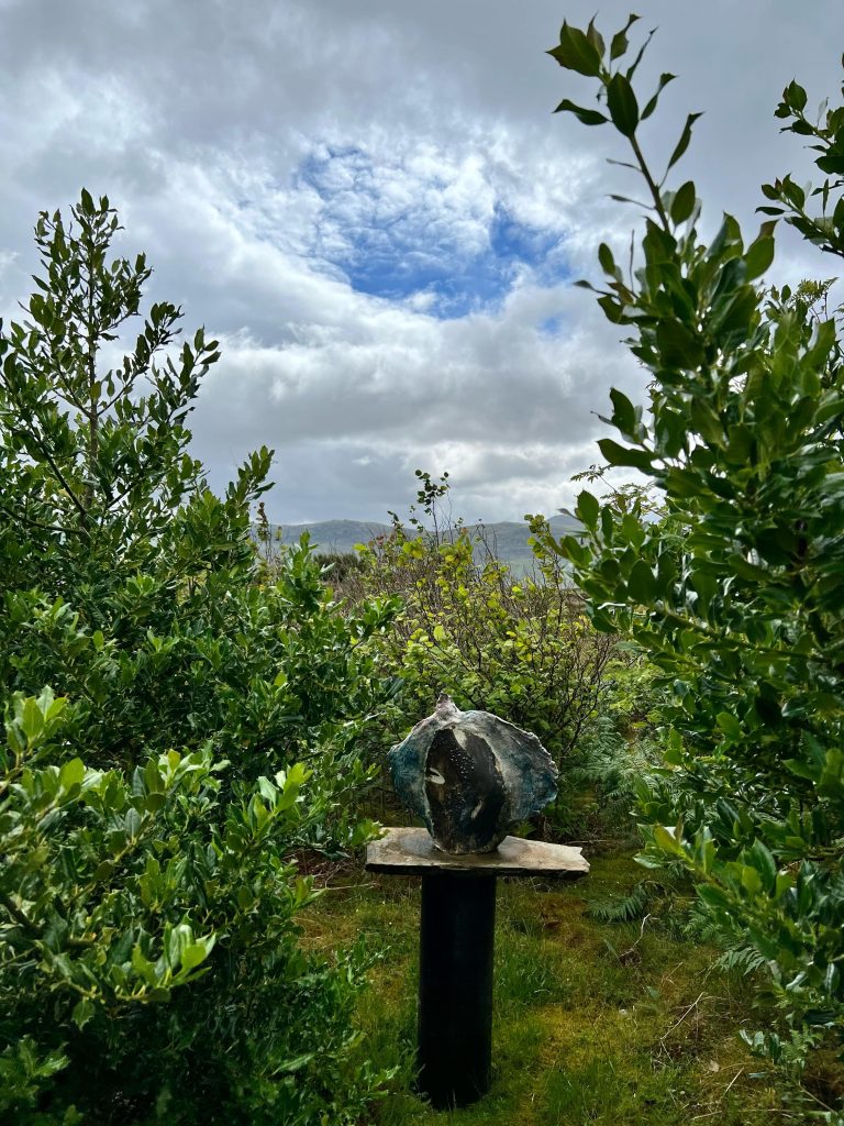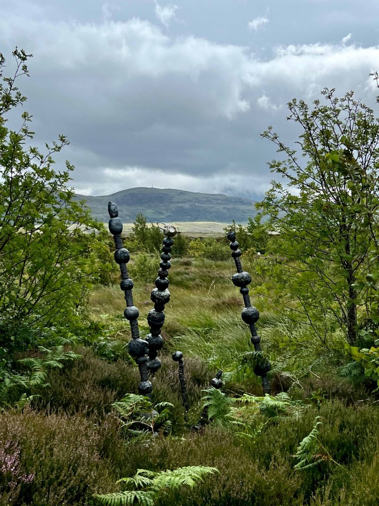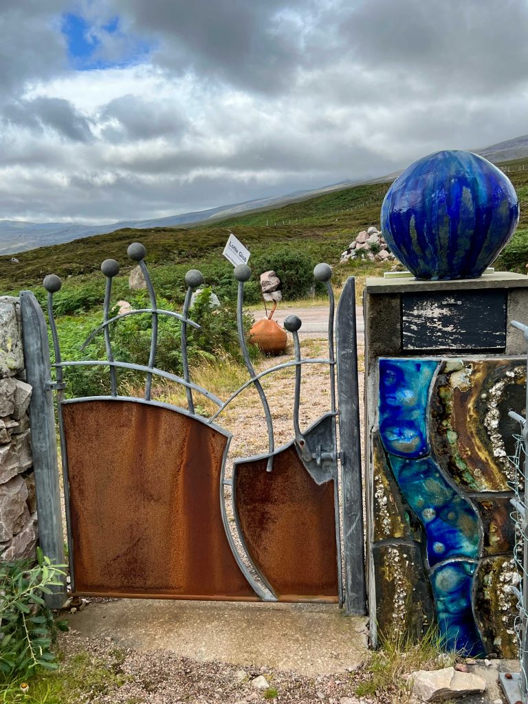 Rundherum ist eine Art „Skulpturenpark” entstanden, in dem ihre von der Natur inspirierten Werk mit ebendieser verschmelzen. Es gibt keinen Lageplan, keinen Wegweiser, man streicht einfach so durchs schottische Land und stößt ab un zu auf Kunstwerke. Aber zuerst stehe ich mal am Eingang und komme mir vor wie ein ungebetener Gast, denn obwohl ein großer Parkplatz angelegt ist, steht keiner darauf. Das Tor ist geöffnet und ihre Webseite lädt ausdrücklich zum Besuch des Gartens ein.