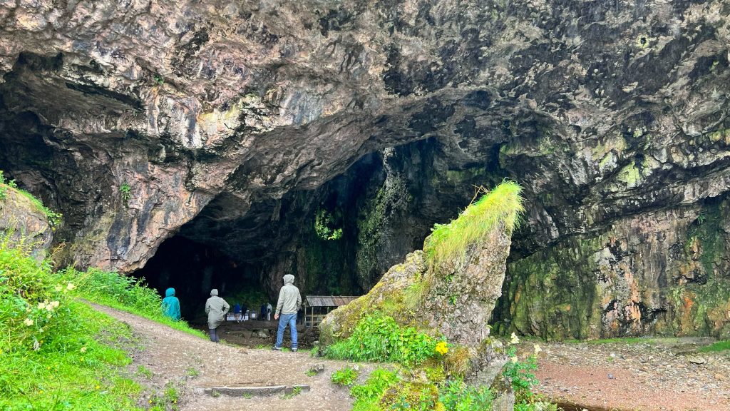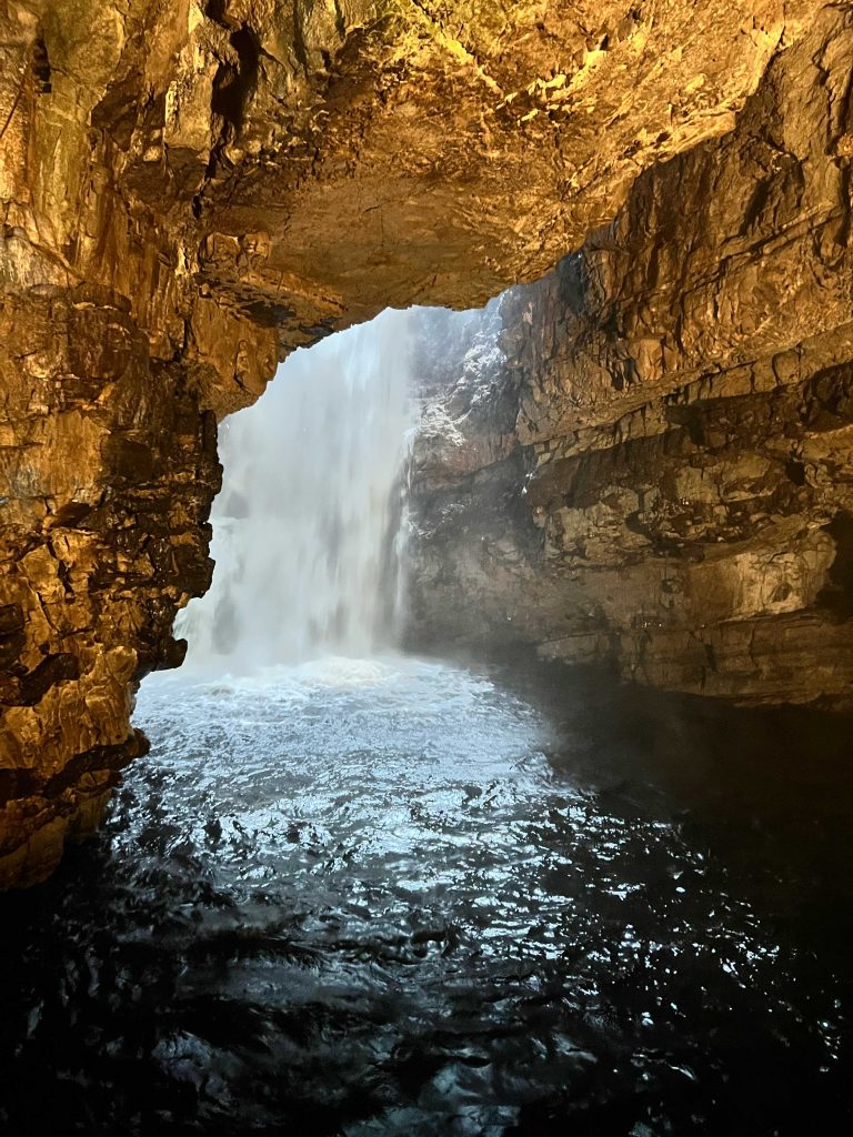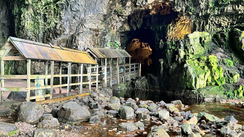 Über Holzstiegen, die wegen des Regens heute sehr rutschig sind, gelangt man hinab und kann in der Höhle einen tosenden Wasserfall bestaunen.