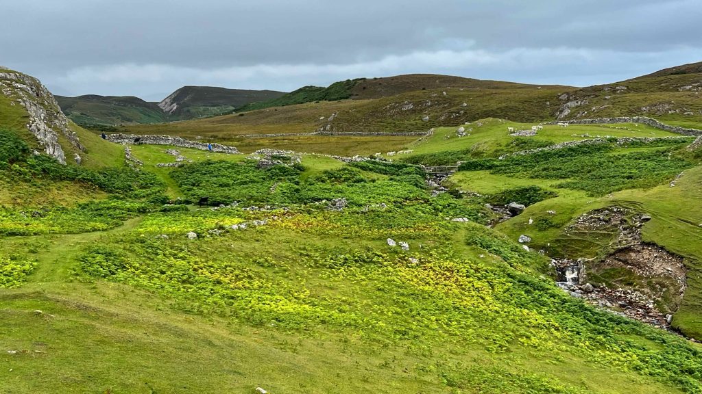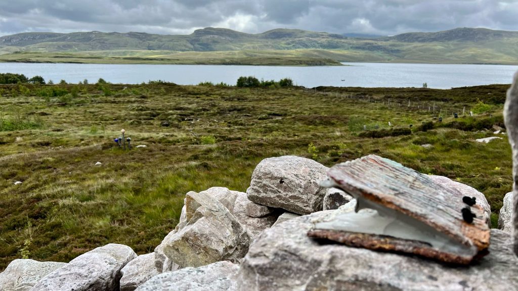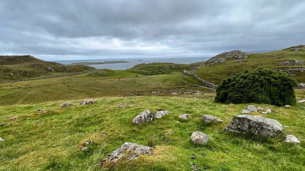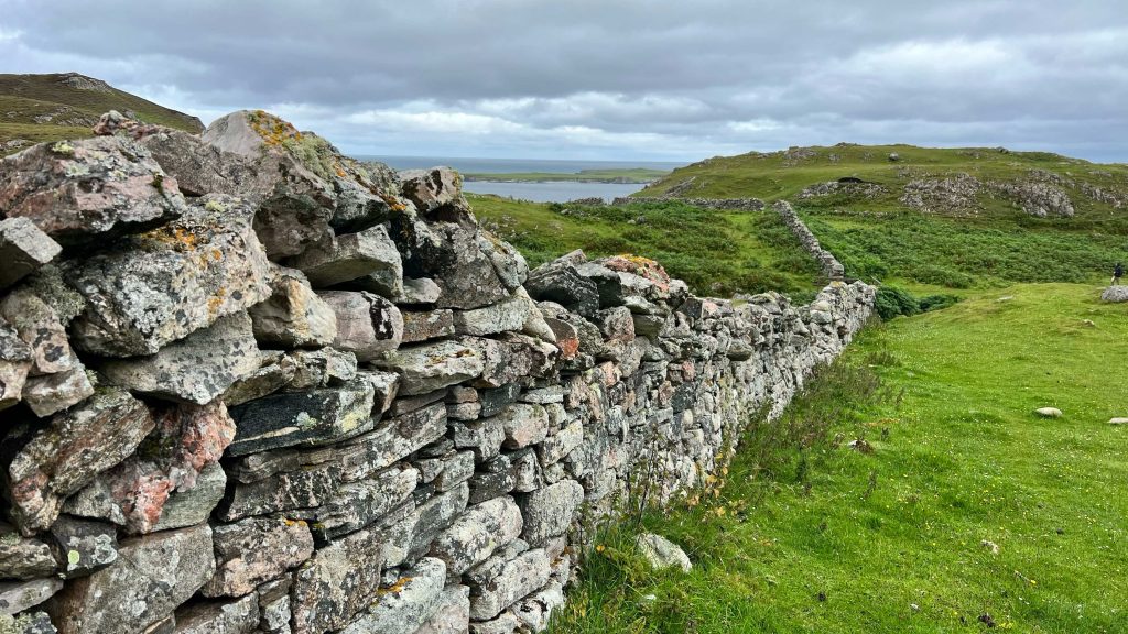 Nix für mich, also weiter. Wir halten bei einer alten Siedlung, die den Clearances zum Opfer gefallen ist an. Mit der Industrialisierung Ende des 18.Jahrhunderts begann neben der Landflucht auch der Bedarf an Schafwolle zu wachsen. So waren die schottischen Gutsherren daran interessiert, soviel wie mögliche Schafe auf die Weiden zu bringen. Dafür sollte die Landbevölkerung weichen. Das geschah auch mit Gewalt und hatte viele Auswirkungen. Mit den Menschen verschwand so zum großen Teil auch die gälische Sprache. Viele Schotten wanderten aus und ihre Kultur verschwand. Allerdings verstehe ich bei den riesigen Flächen hier im Norden nicht, wieso für die Schafe gemeinsam mit den Menschen kein Platz war… Das jedenfalls ist ein Beispiel für die Überreste einer solchen Siedlung und man sieht, welch genialen Platz sich die Bauern damals wählten.