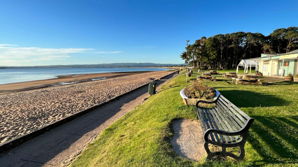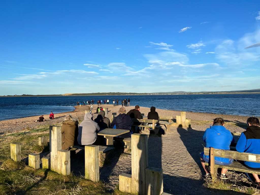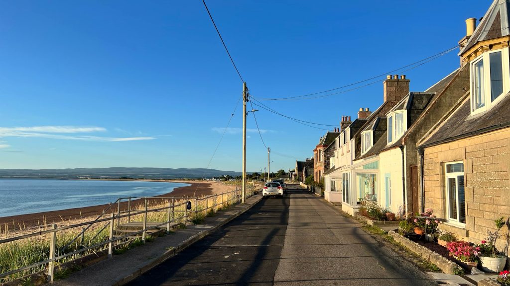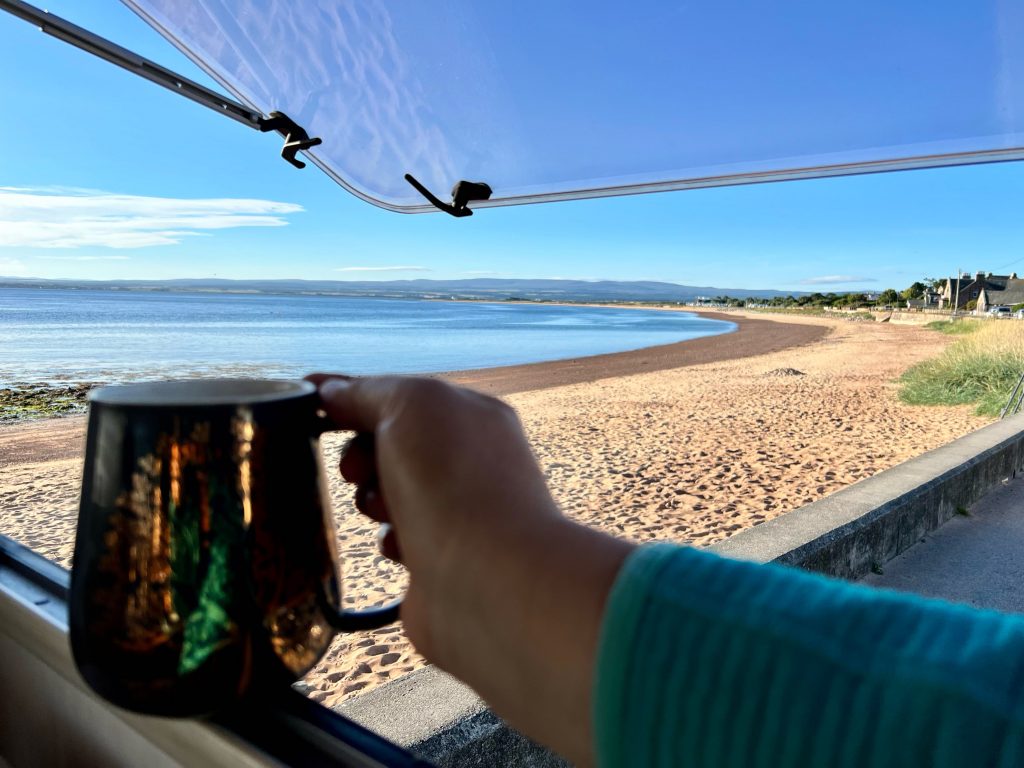 Für die Nacht ziehen wir uns auf den Wanderparkplatz am Ende des Örtchen Rosemarkie zurück. Doch am Morgen wird an den wunderschönen Strand gewechselt. Deutlich wärmer ist es hier. Gegen 7:00 sind wir fast allein und sehen ganz hinten am Ende des Strandes noch einmal den Delfintreffpunkt. Vielleicht laufen wir heute einfach noch einmal dahin, wenn die Flut hoch steht… vielleicht auch nicht. 😜