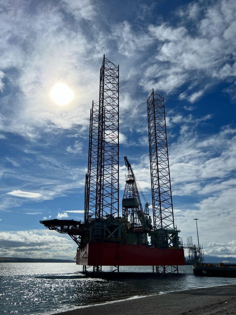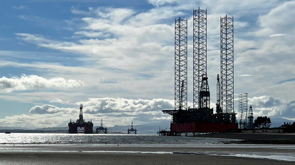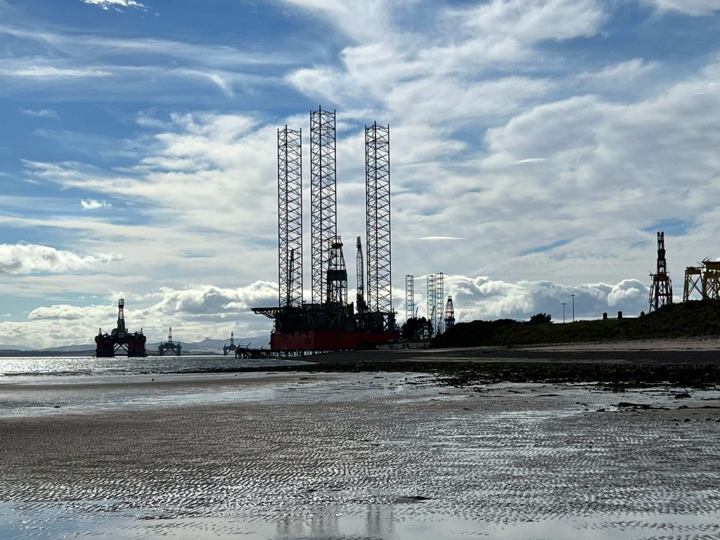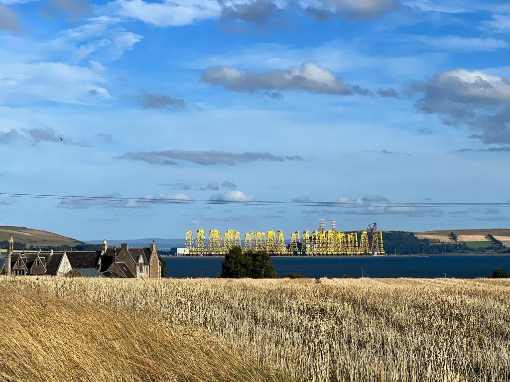 Außerdem werden hier in der Cromarty-Bucht Ölplattformen repariert. Fünf solche Stahlklötze stehen im “Wartezimmer”, auf dass sie an die Reihe kommen.