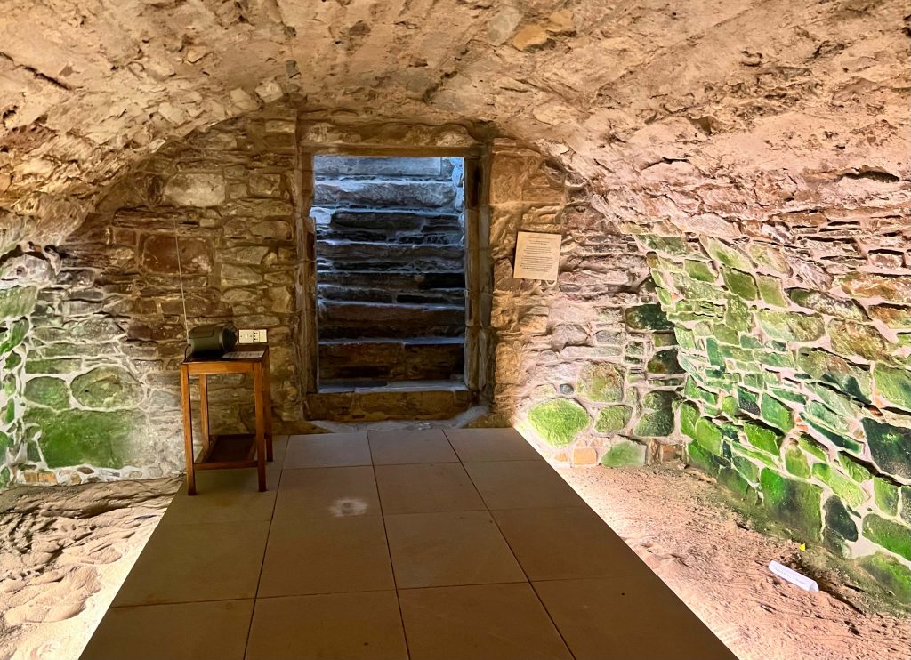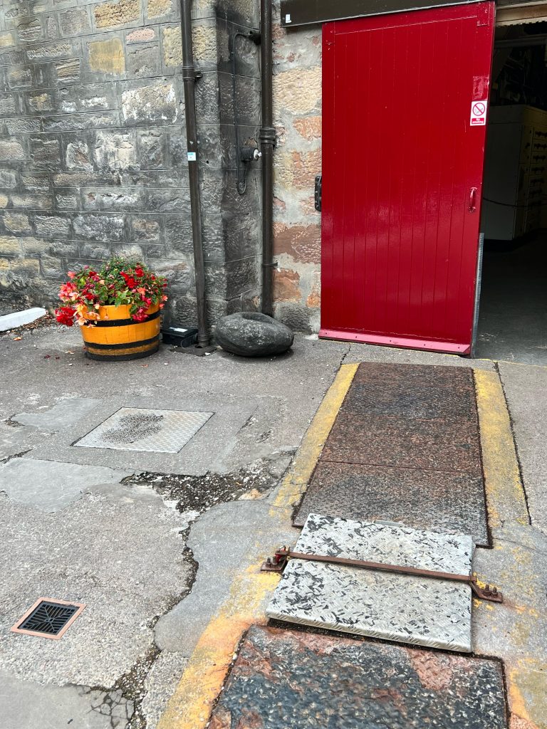 Auf der Führung sehen wir auch einen recht beeindruckenden Unterschied zwischen früher und heute. Wenn die LKWs mit dem Korn heute anrollen, öffnet sich die Luke da im Boden und über unterirdische Gänge befördert man das Korn in die Mühle. Früher wurde der Stein da links genutzt, um das Korn in die kleine Mulde zu schütten und dort mit einem Mörser zu brechen. So kommt man natürlich nicht unbedingt auf die heutige Produktionsmenge von ca. 6 Mio. Liter im Jahr.