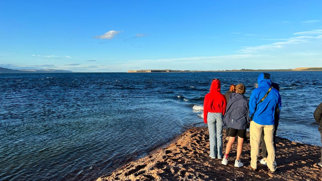 da bin ich nicht allein. Auf der Landzunge stehen schon viele andere Delphin-Süchtige. Mit und ohne lange Teleobjektive warten sie auf die 200 VIPs, die hier mit Einbrechen der Flut wohl sehr oft zu beobachten sind. In der Meerenge zwischen hier und dem gegenüberliegenden Fort Geotge – einer Festung, die nach dem Massaker in Culloden errichtet wurde, um die verbliebenen Schotten in Schach zu halten – herrschen Strömungsverhältnisse, die ein Baden zum tödlichen Unterfangen machen können. Das Strudeln des Wassers macht das schon vom Strand aus deutlich.