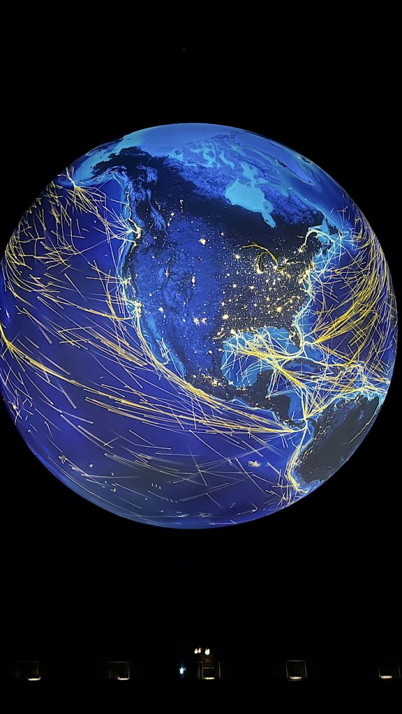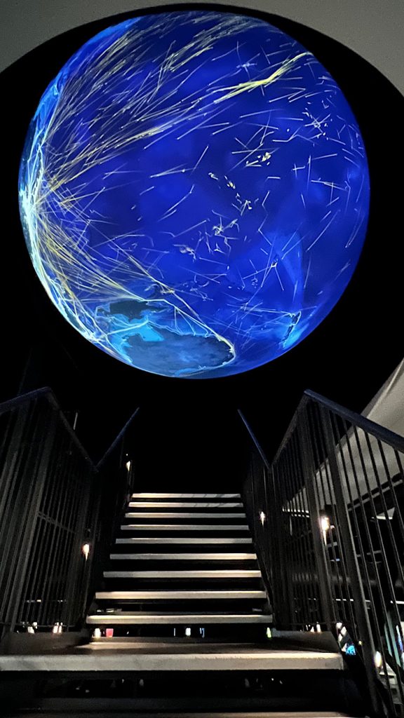 Aber auch Ozeanströmungen, Temperaturunterschiede, Flugverkehrslinien und die Entstehung der Kontinente sind animiert. Ein ca. 10 minütiges Programm lässt uns staunen und auf Kissen liegend in einer Art Amphitheater die Zeit vergessen.