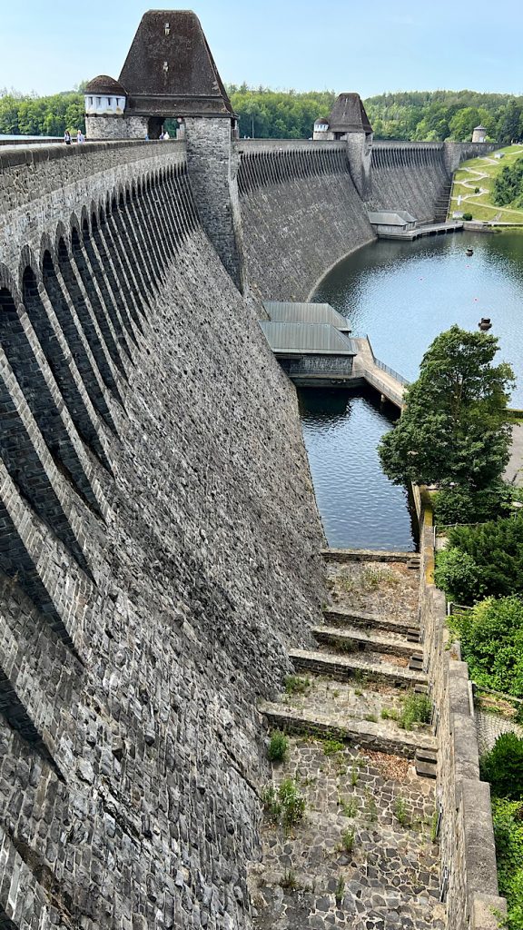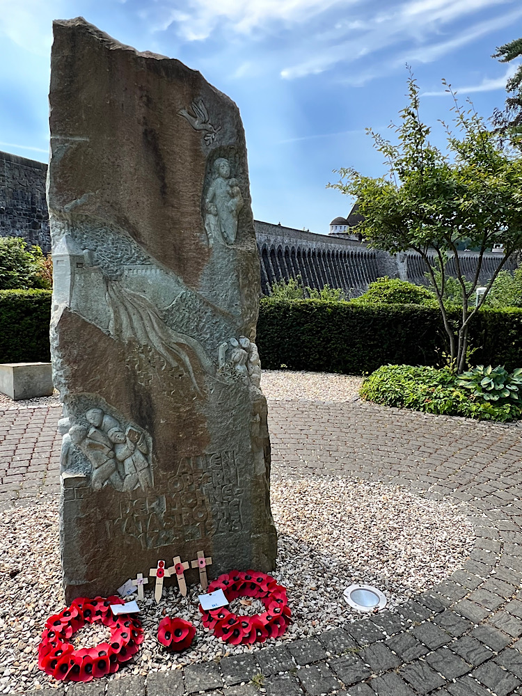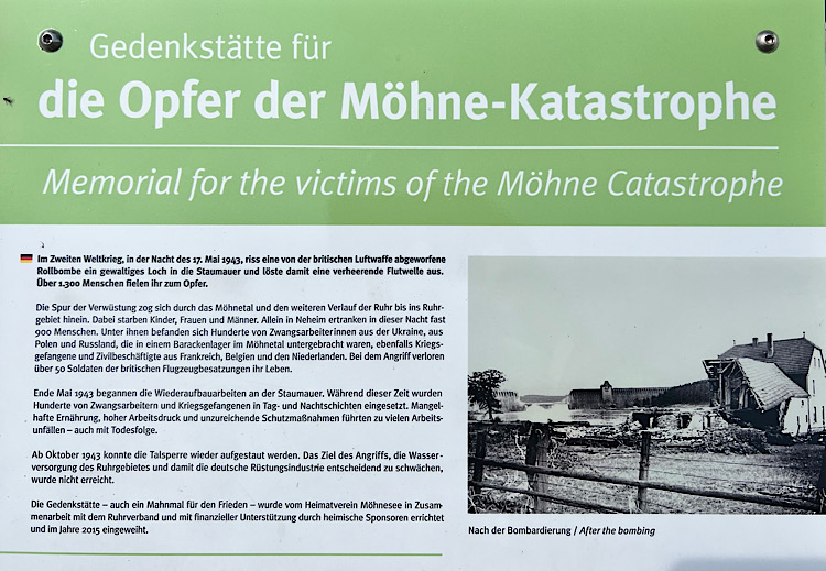 Gegen 12:00 startet der Dicke und rollt bis zur Staumauer. Die hatten wir im letzten Jahr nicht angeschaut und bemerken heute, dass der Wasserstand beachtlich ist. Dort wo im letzten Jahr noch Sonnenanbeter im Sand (na ja eher Dreck) lagen, steht heute das Wasser. Hier erinnert auch ein kleines Denkmal an die Opfer der Bombardierung der Mauer im 2. Weltkrieg.