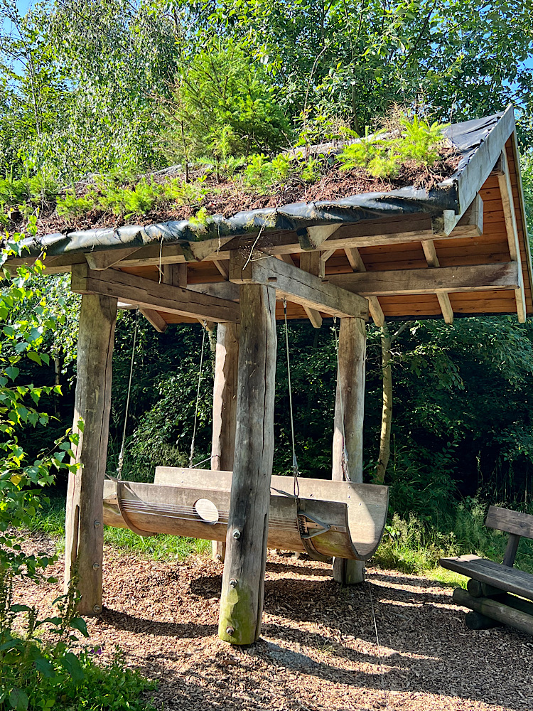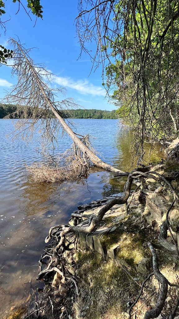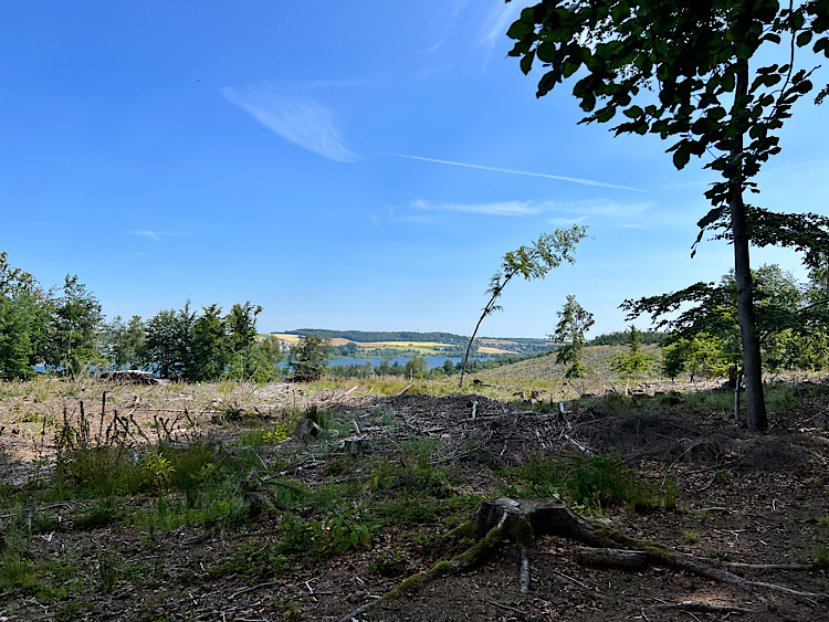 Der nächste Tag beginnt mit einer Wanderung. Möglichst zeitig, die Luft ist noch kühl, machen wir uns auf den Weg. Wie schon im letzten Jahr, sind die Waldbestände gelichtet. Den Möhne-Turm lassen wir rechts liegen und wandern gleich drauflos. Ein eigens errichteter Klangwald erinnert an die Schäden, die 2007 der Wirbelsturm „Kyrill“ hier angerichtet hat. Weht der Wind aus einer besonderen Richtung, erklingen die Instrumente in schauerlich schönem Misklang.