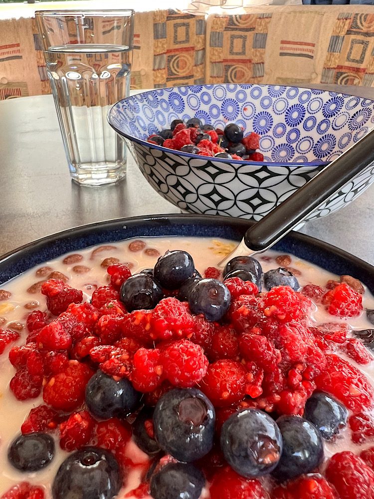 Auf dem Rückweg sammle ich noch Himbeeren satt. Etwas mühsam ist das schon, aber gemischt mit den letzten Blaubeeren von zuhause ergibt das ein frisches Mittagsmahl.