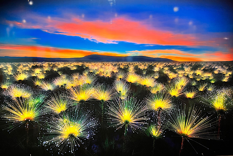Auch die „Wunderkerzen im Cerrado“ von Marcio Cabrai lassen den Besucher erstaunen. Diese Blüten einer Wildblume erstrahlen im Schein der untergehenden Sonne und wirken hier im Gasometer durch den großen Glasprint besonders farbenfroh.
