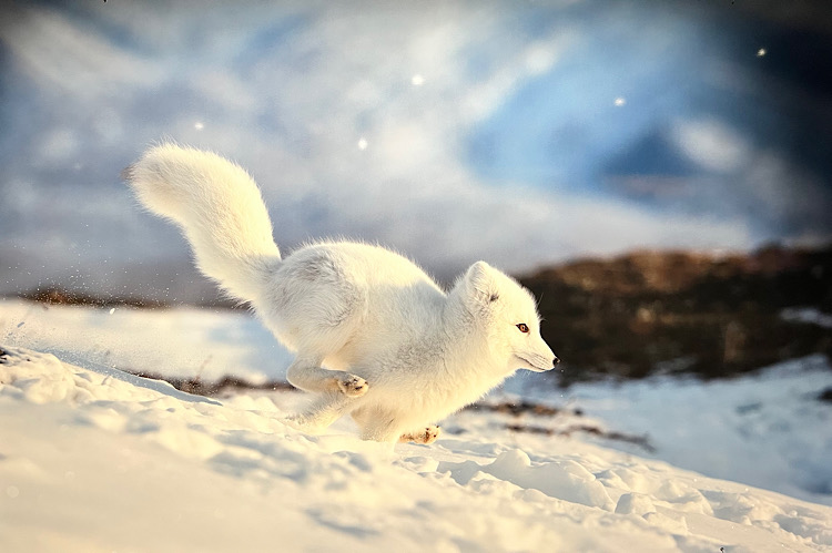 Auf dem Bild „Eierdieb“ von Sergey Gorshkov flitzt ein Polarfuchs in Ostsibierien durch den Schnee. Die Ankunft der Schneegänse ist für die Füchslein der Startschuss für ein Festmahl, denn Gänseeier sind eine Delikatesse.