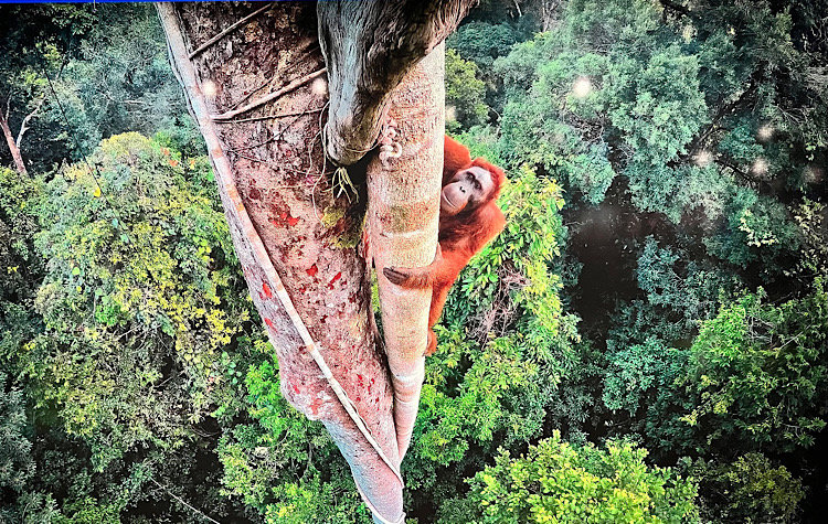 Tim Laman stellt sein Foto eines jungen Orang Utans aus, der 30m über dem Waldboden an einer Würgefeige klettert. Die Kamera platzierte er dazu mit Fernauslöser in dem Baum, nachdem er das Tier mehrere Tage beobachtet hatte.