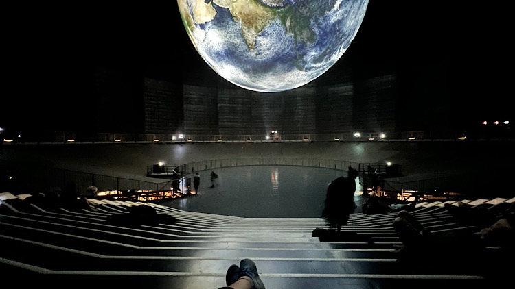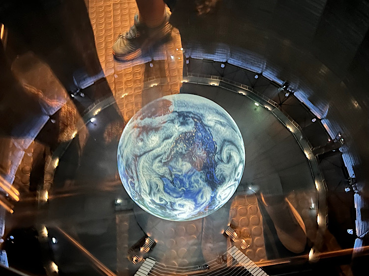 Das Highlight befindet sich allerdings im dritten Stock des Gasometers. In dem 100m hohen Luftraum des Gasometers hängt eine riesige Weltkugel mit einem Durchmesser von 20m. Hochaufgelöste Satellitenbilder werden durch mehrere Projektoren darauf aufgebildet und wir sehen die Erde aus der Perspektive eines Astronauten.