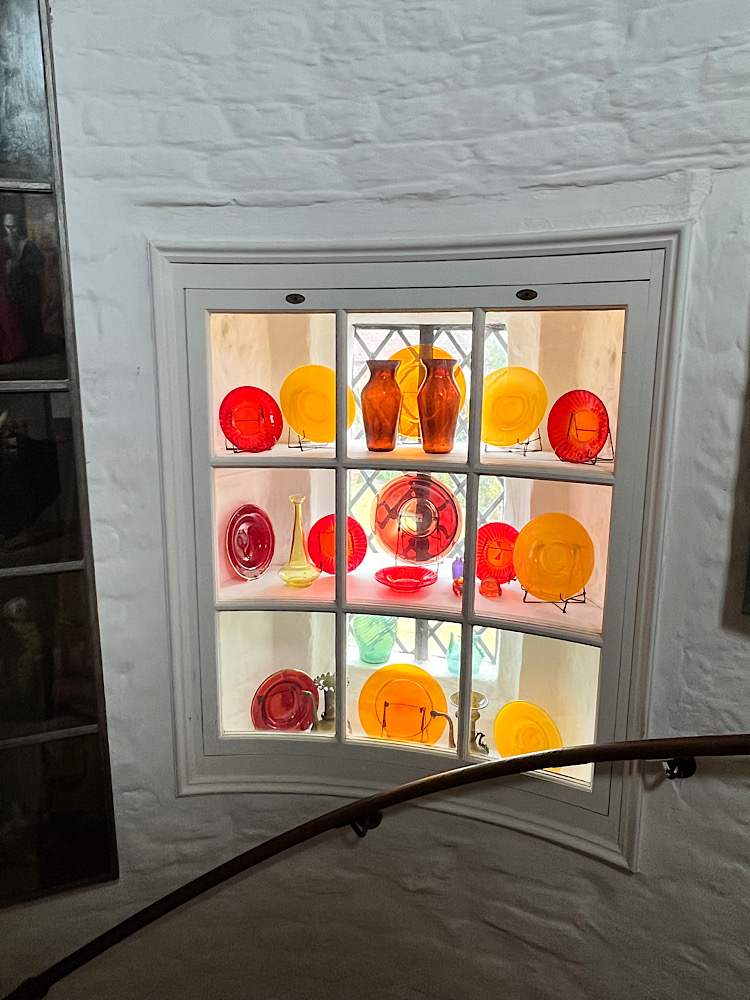 Der Aufgang ist dekoriert mit in den Fenstern leuchtenden Glasgegenständen.