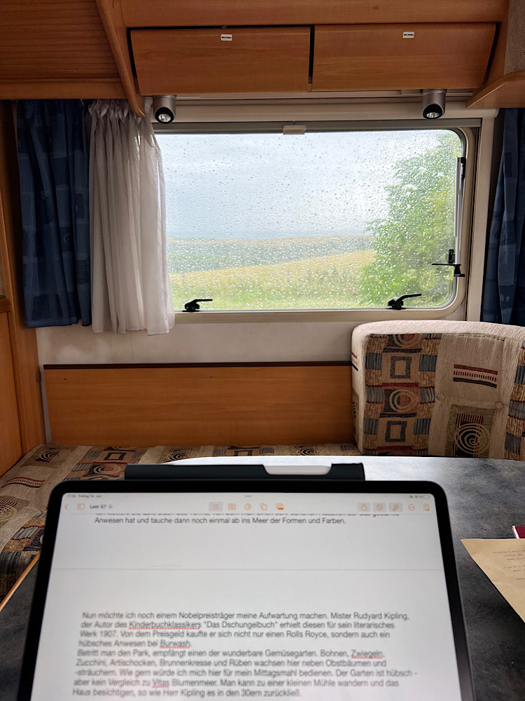 Wir wollte ja eh Pause machen und nach unserem kleinen Spaziergang ist das nun auch soweit. Ab 17:00 ist schreiben, lesen, faulenzen angesagt… denn draußen schüttet und stürmt es.