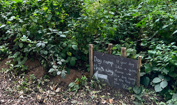 Wir wandern also los und wen treffen wir? Meine Ranger von gestern Abend. Hinter dem Haupthaus ist ein kleiner Weiher versteckt und durch ein Schild wird Hundebesitzern mit wasserbegeisterten Tieren der Weg gewiesen.