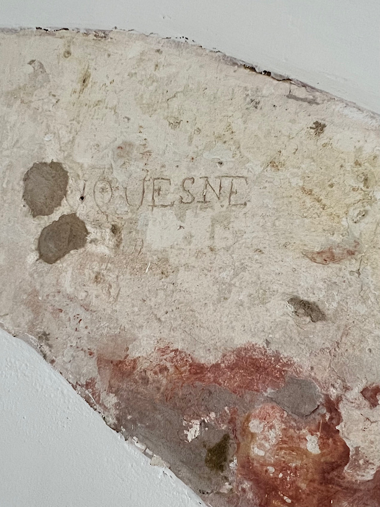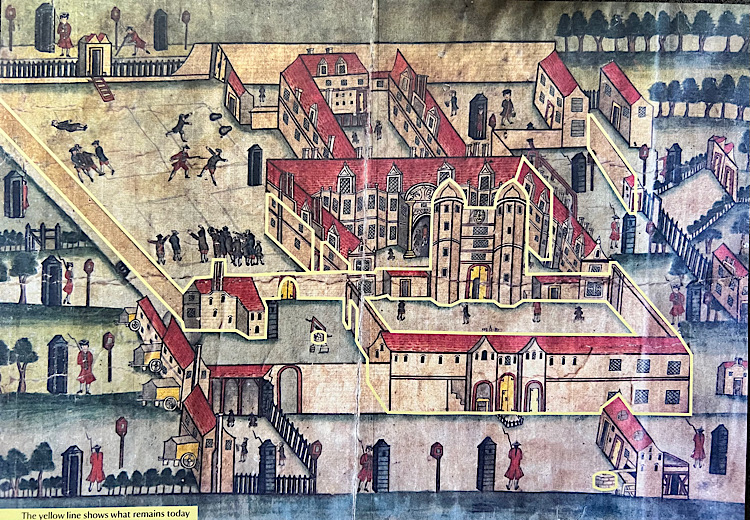 An den Wänden der oberen Kammern kann man aber auch noch geritzte Inschriften, der hier im 16.Jhd. inhaftierten französischen Seemleute aus dem siebenjährigen Krieg finden. Bis zu 3000 Soldaten sperrte man in diesem Anwesen ein und auf dem Bild kann man die damaligen und (mit der gelben Linie markiert) die heute erhaltenen Gebäudeteile erkennen.