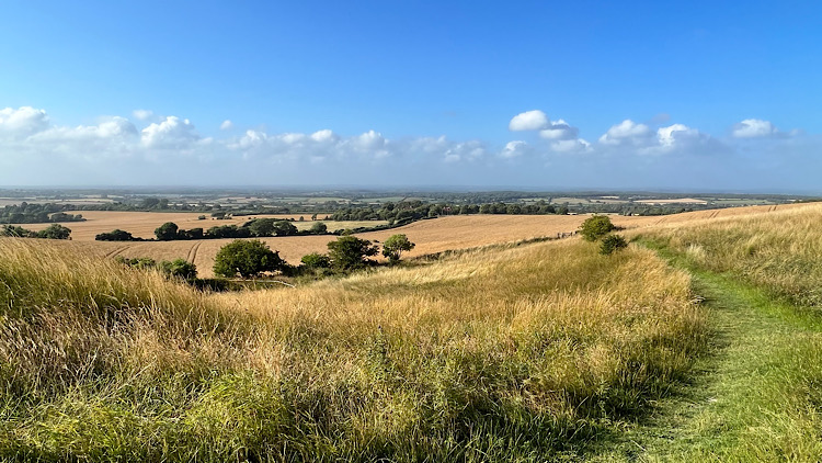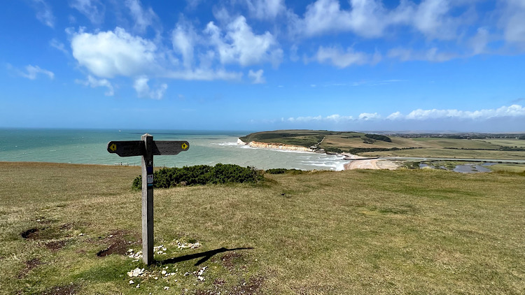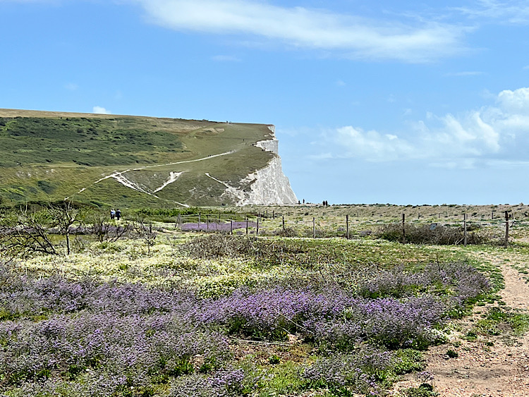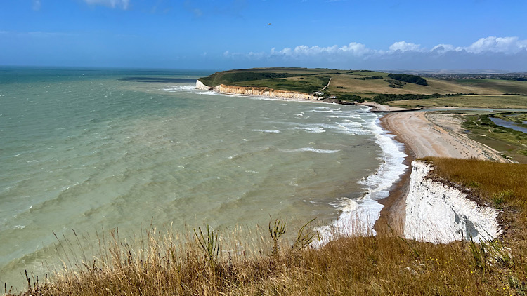 Oben angekommen öffnet sich der Blick auf das schönste Stück Steilküste, das Südengland zu bieten hat. Nach rechts und links setzen sich die weißen Felsen fort und strahlen in der Mittagssonne.
