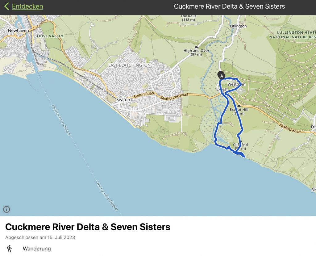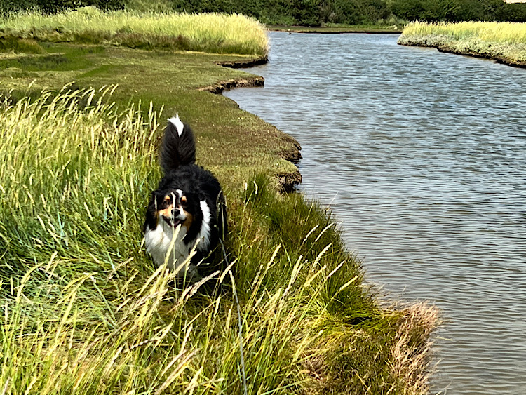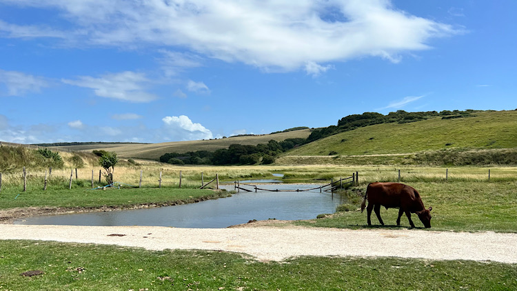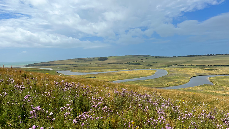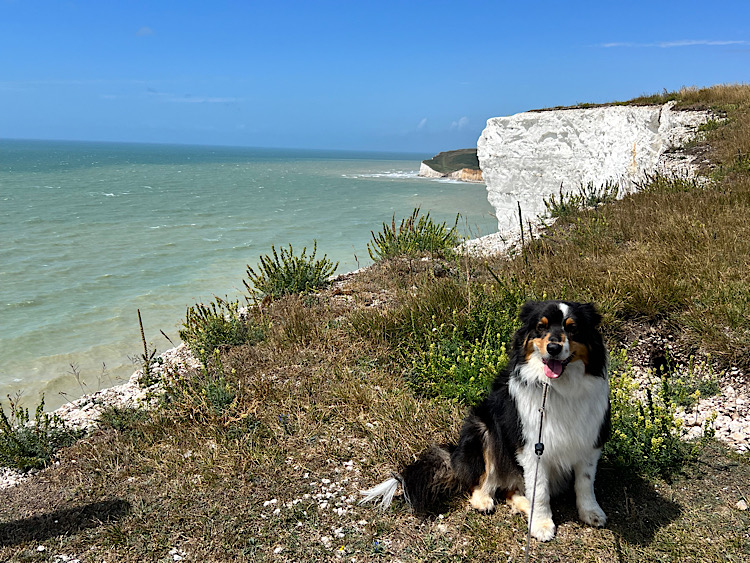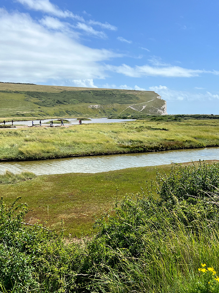 Ein Stück der Kalksteinklippen „Seven Sisters“ möchte ich heute laufen und starte auf dem Parkplatz im Wald. Der Seven Sisters Country Park umschließt ein wunderschönes Delta. Der Cuckmere River mäandert hier in den Kanal hinein. Heute ist Samstag und nicht nur ich habe mich auf den Weg gemacht. Wählt man allerdings den Weg über die Weiden, so ist man fast allein. Der Wind pfeift, die Sonne strahlt, seltsame Insekten sitzen auf dem Jakobsgeißkraut und Luna genießt die Weite – kein Schaf, was sie aus dem Konzept bringt, kein Reh hinterm Gebüsch, sie streift einfach durch das kurze Gras… wunderbar.