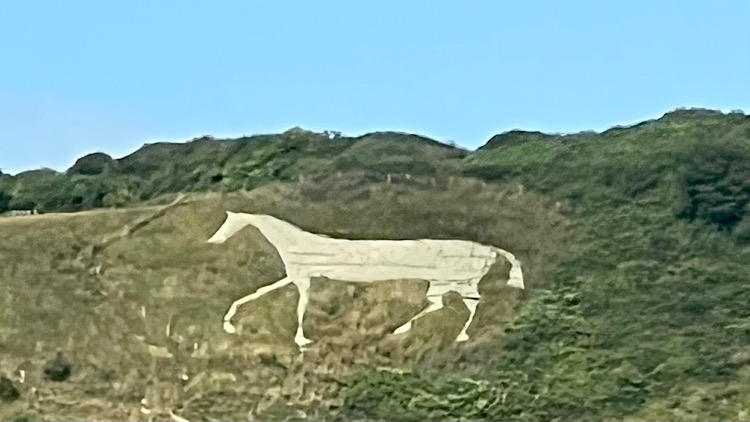 Es geht in Richtung Alfriston. Das soll ein hübsches mittelalterliches Dorf sein. Unterwegs kommen wir am Pferd von Litlington vorbei. Das ist ein in den weißen Kalk geritztes Pferd. In einer Nacht sollen es drei Männer im Jahr 1924 aus dem Rasen geschnitten und damit ein Vorgängerpferd aus dem 19. Jhd. ersetzt haben. Weiße Pferde in den Kalkstein zu ritzen scheint in Südengland ein gern ausgeübtes Hobby zu sein. Davon gibt es mehrere.
