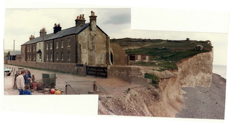 Besonders eindrucksvoll ist das Ergebnis der Erosion zu sehen.  Von einer – aus welchem Grund auch immer an dieser Stelle erbauten – Wohnanlage stehen noch 4 Reihenhäuser. Das waren mal doppelt so viele. Der Marktpreis der Immobilien ist sicher überschaubar. Hier ein Bild von 1987 – dann eins von heute…