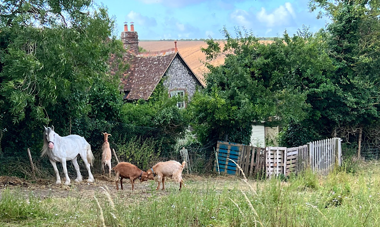 Wunderbar, dann statten wir ihm nun doch noch einen Besuch ab. Allerdings hat um die Uhrzeit weder ein Café noch eine öffentliche Toilette geöffnet. Dafür finden wir einen kleinen Hof am Wegesrand, auf dem die kleinen Böckchen ihre morgendlichen Kämpfe ausfechten und der Schimmel stoisch daneben steht.