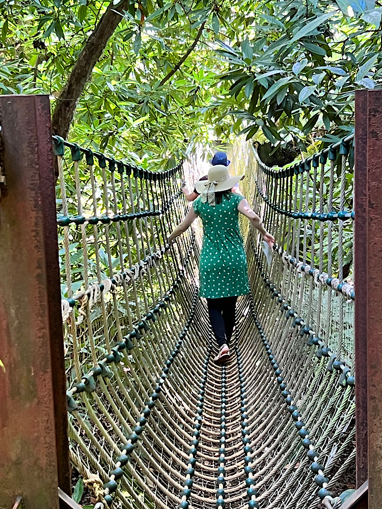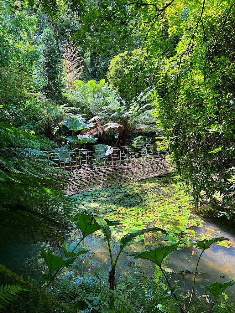 Kleine Gartenhäuschen, eine Gartenschaukel, Brücken und Sitzplätze, Brunnen und Liegewiesen machen den Rundgang lauschig, nur über die Hängebrücke kann ich Luna nicht bewegen, ist ja auch zu verstehen.