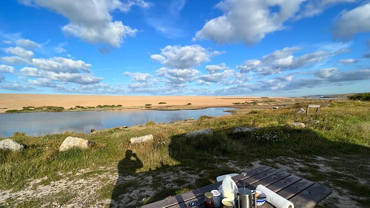 …bis ein Hundebesitzer seinen freilaufenden Schnuffi an unserem Womo entlangführt. Soweit so gut, nur als Luna diesen fröhlich wedelnd begrüßen will, schreit der Typ mich an, ich solle meinen Hund „under control“ bringen… Hm, welcher Vierbeiner besuchte uns gleich nochmal ohne Leine? Grundsätzlich sind die Briten aber wirklich ein freundliches Völkchen, immer auf einen Small-Talk aus und meist ungemein hundefreundlich. Aber Ausnahmen bestätigen ja bekanntlich die Regel. So wende ich mich einfach wieder meiner herrlichen Frühstückslocation zu:
