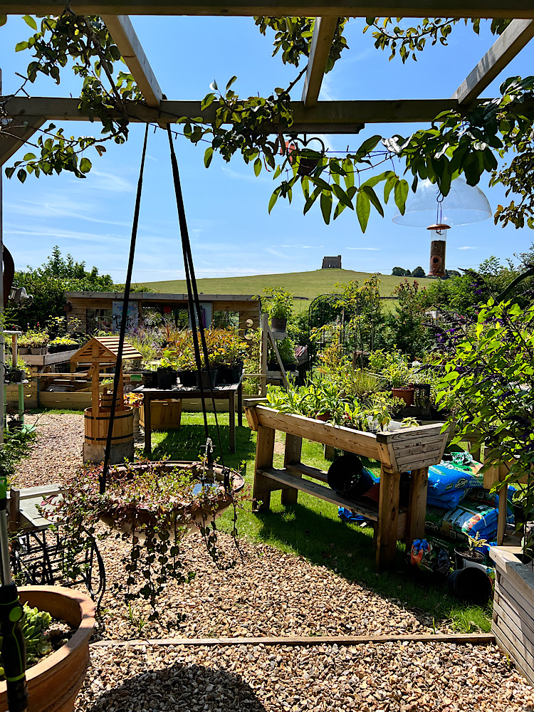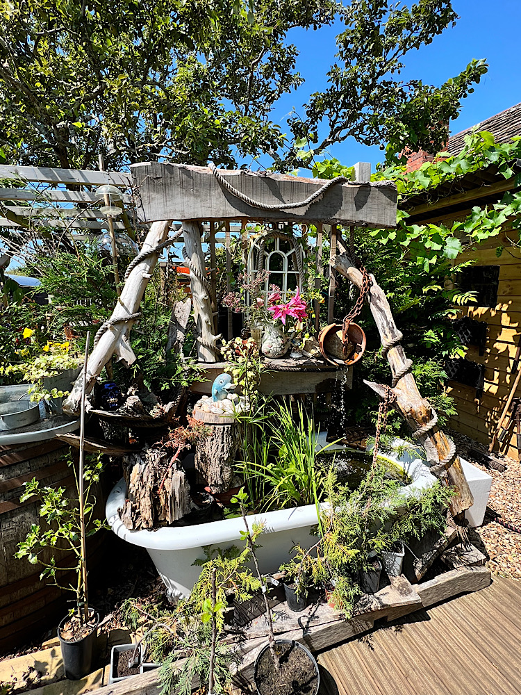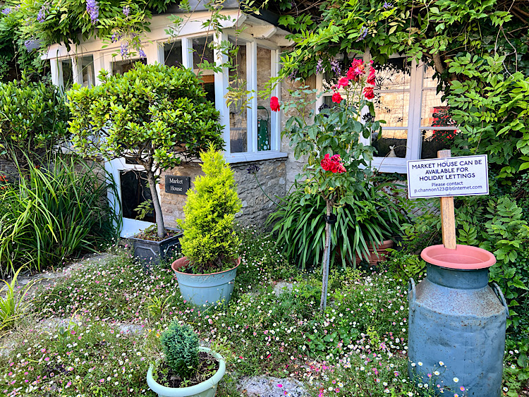 Der Blick über den Gartenzaun wendet sich hinauf zur Kapelle St. Catherine und auch die Haustiere werden vorgestellt. Hinter dem Brunnen links wohnen z.B. die Schildkröten Sandy und Wendy, es gibt auch Kaninchen und Katzen. Letztere sind aber verschwunden. Wahrscheinlich haben sie Luna kommen sehen. Kleine Tische können zum Kaffeepäuschen genutzt werden und durch Minitüren betritt man Hinterräume des Hauses, in denen Trödel angeboten wird. Vorn arbeitet der Hausherr und pflanzt die Setzlinge um. Auch Säcke mit Blumenerde liegen bereit und können erworben werden.