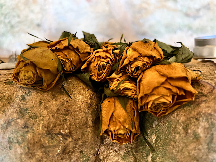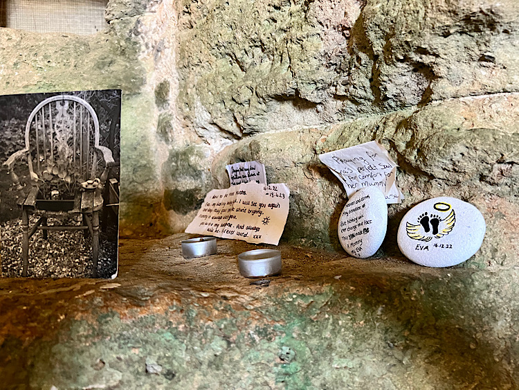 Oben angekommen freue ich mich, dass hier nicht das übliche Schloss an der Tür hängt und man einfach eintreten kann. Das alte Tonnengewölbe bietet eine fantastische Akustik und ich muss gleich mal ein bisschen trällern, um das zu genießen, so ganz für mich allein. Bis auf ein paar rührende Steine, Zettel und Briefe, die jemand in Gedenken an liebe Verstorbenen auf dem alten Mauerwerk platziert hat, ist im Innenraum des Gebäudes nichts mehr vorhanden.