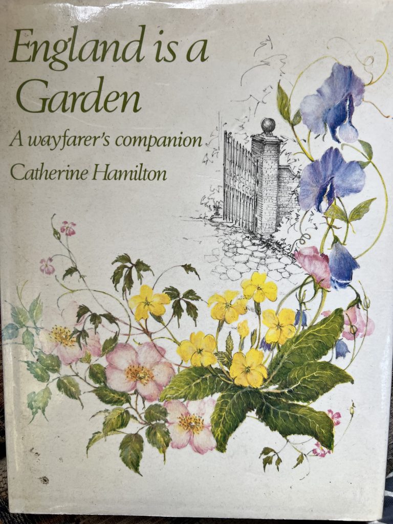 Ein altes Buch habe ich mir aus dem Trödel herausgefischt: „England is a Garden“ von Catherine Hamilton. Die begabte Zeichnerin ist dem dem Campervan 1984 vom zeitigen Frühjahr bis in den späten Sommer durch England gereist und hat immer bestimmte Pflanzen mit den Orten verbunden, an denen sie diese entdeckt hat, die dort eine besondere Bedeutung haben oder die Empfindungen der Autorin wiedergeben. Dazu zeichnete sie immer ein Gebäude, das sie an diesem Ort besonders fasziniert hat.