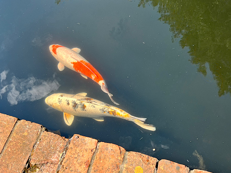 Im Seerosenteich schwimmen 4 Kois und auch andere kleine Fische, die man mit bereitgestellten Futter verwöhnen kann. Als Luna die Tiere im Wasser entdeckt, ist sie so erschrocken, das auch die Fische entsetzt zurückweichen. Dann schlägt sie die gefährlichen Feinde durch kräftiges Gebell in die Flucht.