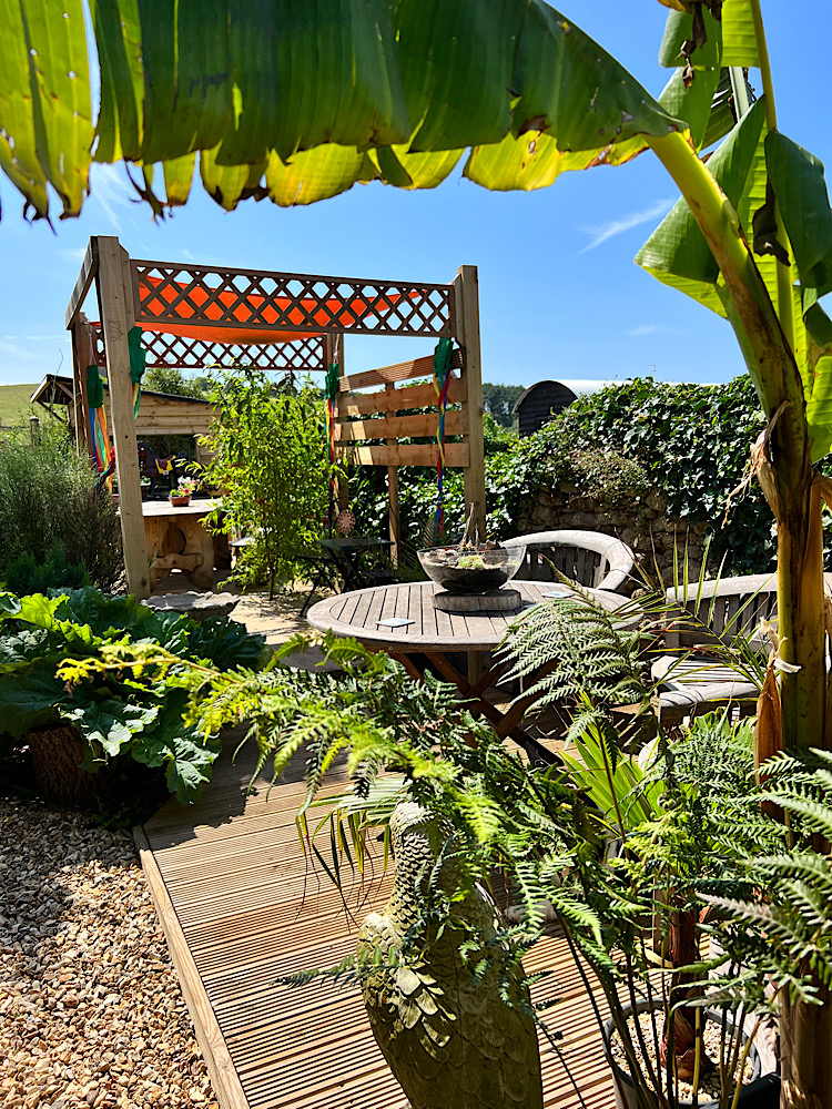 Auf hölzernen Bänkchen stehen ein paar zierliche Pflänzchen mit Kasse des Vertrauens bereit. Doch tritt man weiter hinten durch die Einfahrt, dann öffnet sich ein kleines Paradies. Fast meint man in einem besonders erfinderischen Privatgarten gelandet zu sein. Aber diese Kombination aus Garten, Cafe und Gartencenter ist wunderbar. Der Besitzer hat hier ein Refugium geschaffen, in dem man verweilen möchte. „Dogs welcome – human tolerated“ steht am Eingang. Und ein Schild, dass man alles hier kaufen kann, wenn man mag: Pflanzen, Geschirr, Vogeltränken, Türstopper, Brunnen, Statuen, Tische und Stühle usw….