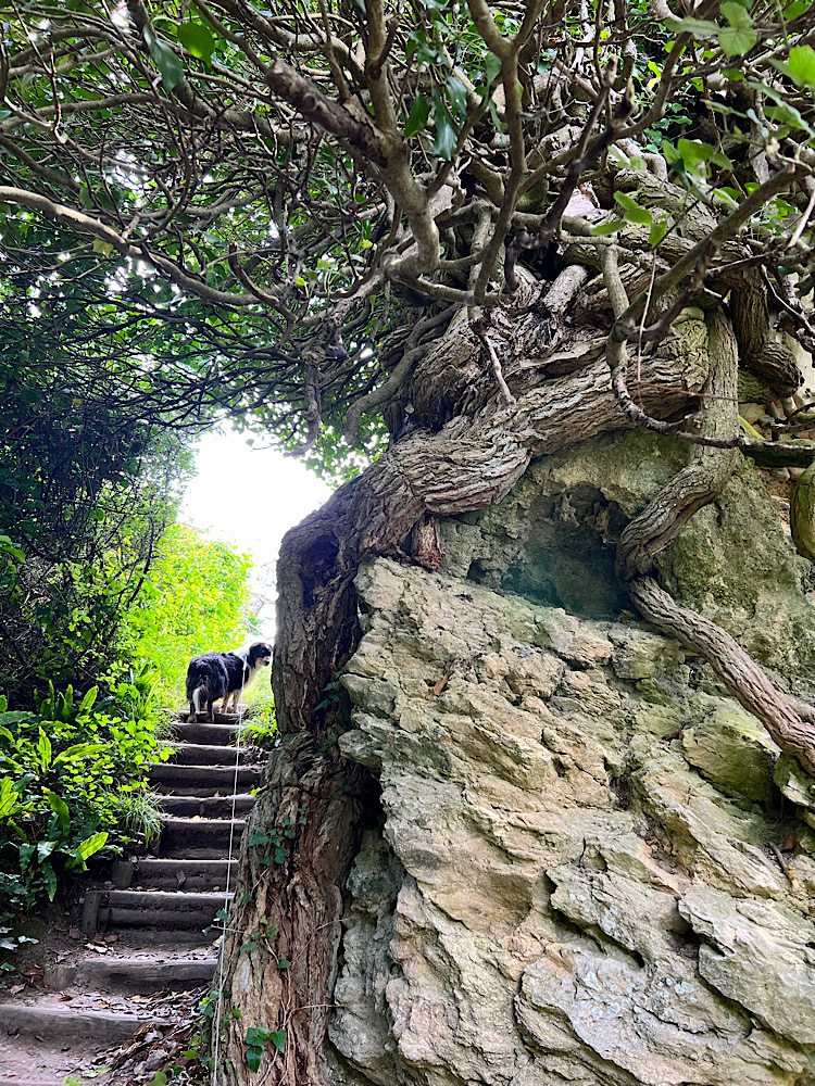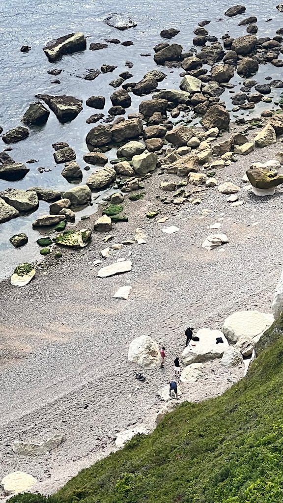 Ein paar einsame Urlauber, viele fröhliche und nicht verbotene Hunde verbringen hier neben einem netten Café den Tag. Da oben links geht er weiter, mein Küstenwanderweg, hinauf zu den Klippen mit einem wunderschönen Blick.