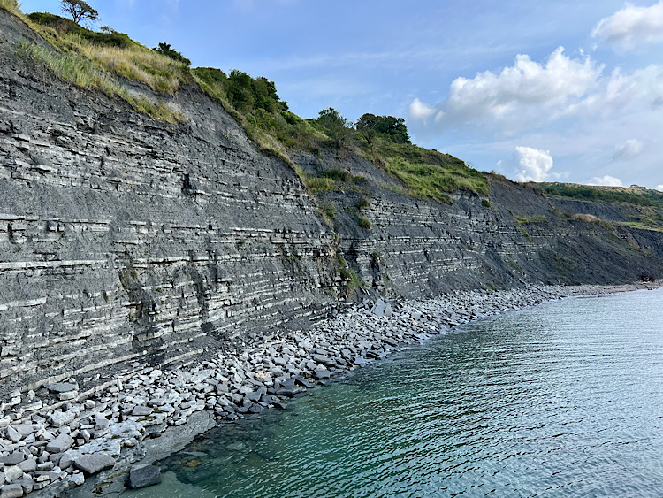 Lyme Regis ist unser erster Stopp am heutigen Tag und vom großzügigen Parkplatz oberhalb der Bucht führen 114 Stufen hinunter zur Mole. Dort wird man gleich in die Geheimnisse der Fossilienkunde eingeweiht und wenn erst die Flut weicht, wird auch der Strand von Fossiliensammlern besucht.