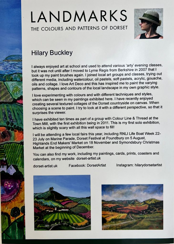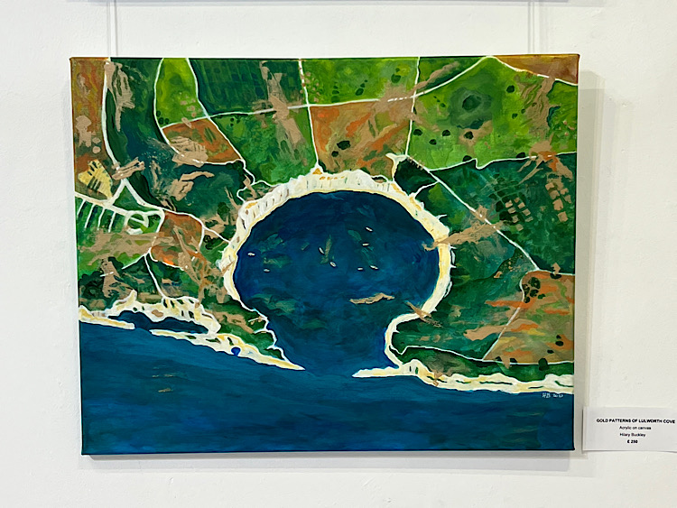 Ich schaue mir die Ausstellung „Landmarks“ von Hilary Buckley genau an, weil sie mit ihren fröhlichen Farben und verschiedenen Stilistiken sehr einladend wirkt. Die Künstlerin ist selbst anwesend und erzählt, dass das ihre erste Einzelausstellung sei. Gleich erkenne ich sie wieder unsere kreisrunde Bucht von neulich.